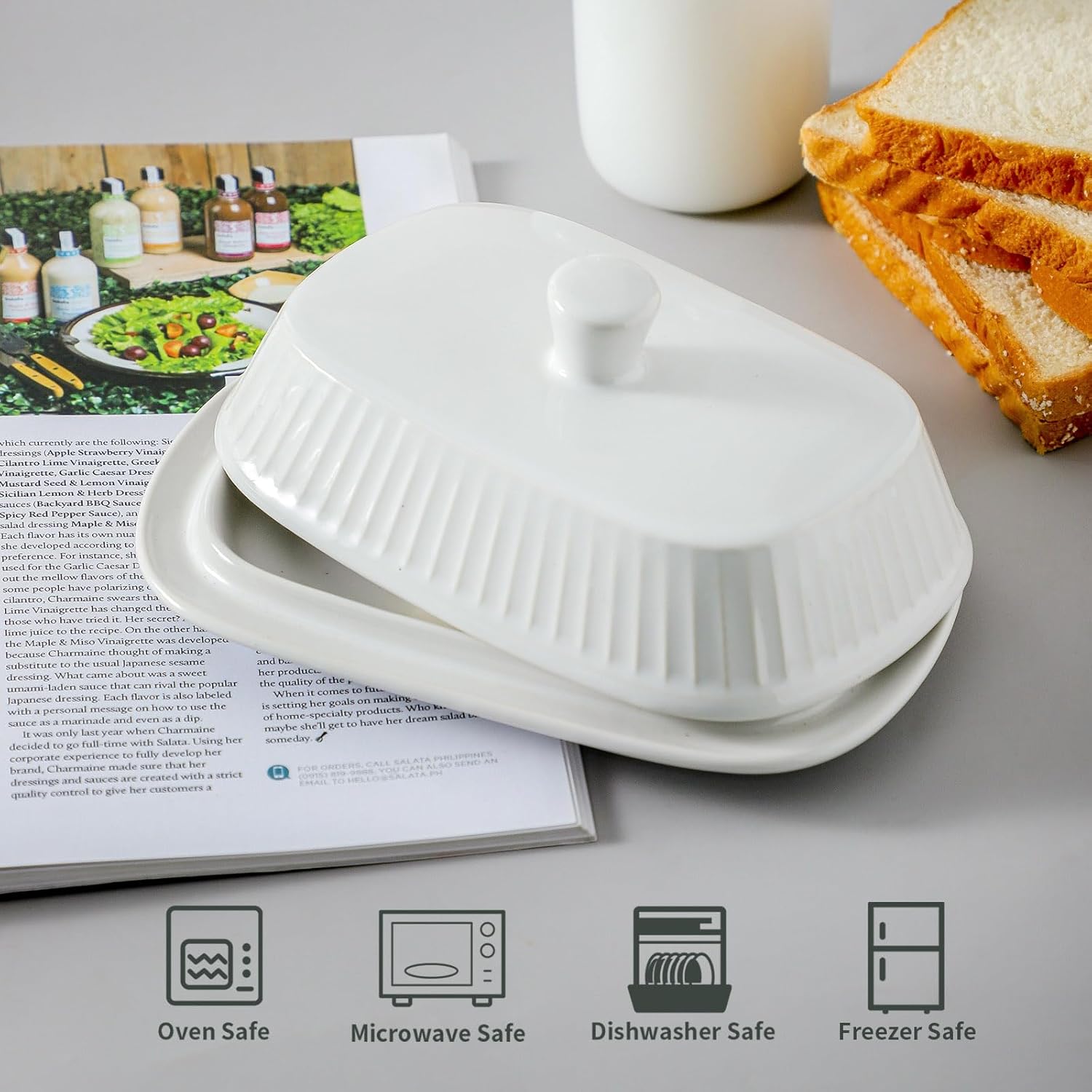 Hasense Porcelain Butter Keeper, Butter Dish with Lid, Large Butter Containe with Cover, Butter Holder for West East Coast Butter, Kitchen Decor, Housewarming Gift, White