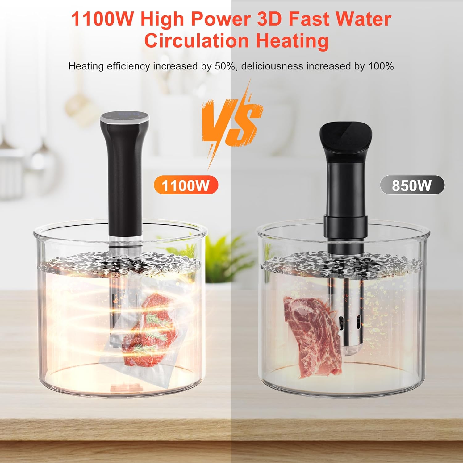 - 【1100W Ultra-Quiet Fast Heating】This sous vide cooker realizes 1100W ultra-fast water heating. It adopts an ultra-quiet design, below 20 dB within 1 meter, and efficiently transfers heat through a 360° water circulation system. The constant temperature prevents the fiber of the ingredients from being destroyed and easily achieves the high-quality cooking effect of the Michelin restaurant level. and you can cook various ingredients such as beef, chicken, pork, vegetables, fish and shellfish, eggs