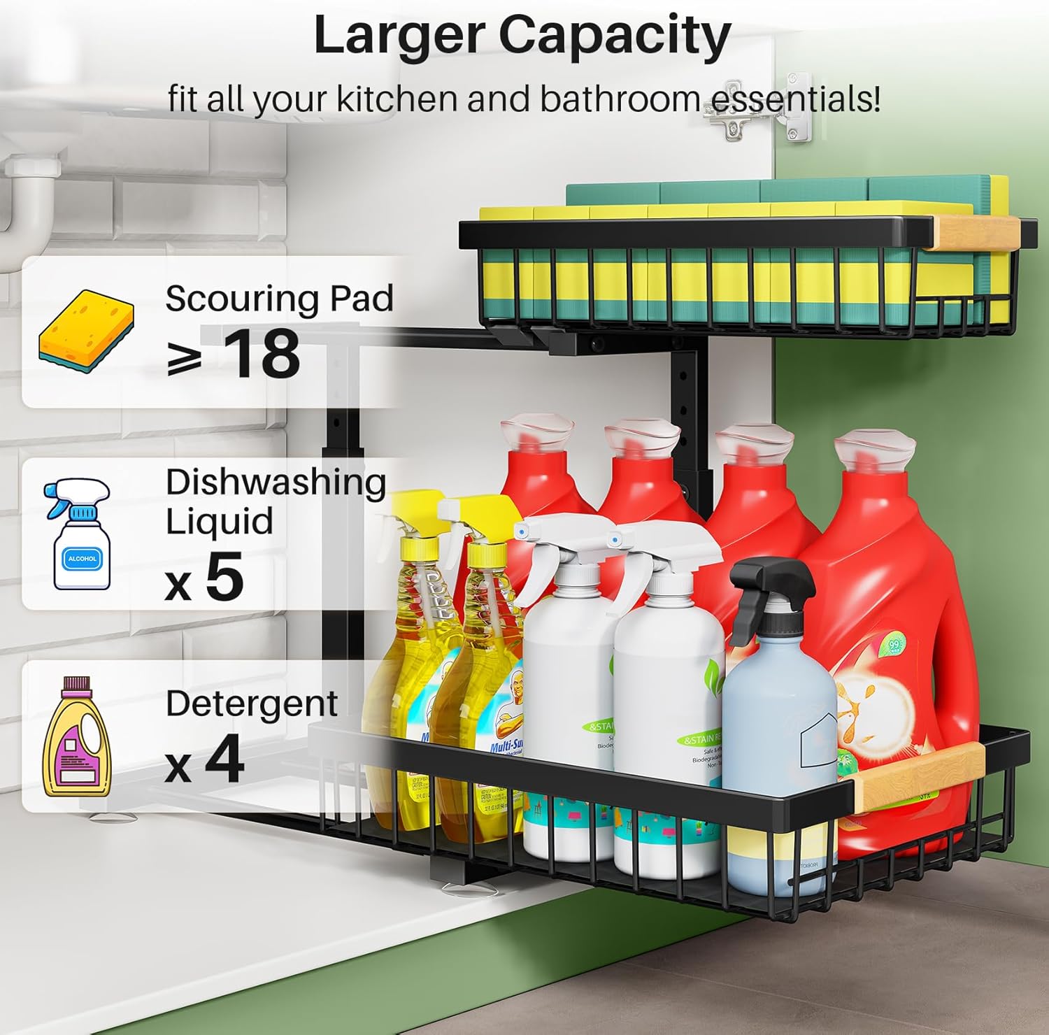 - Larger Organizer for Maximum Efficiency: This under sink organizer, measuring 11.8"W x 15.9"D x (13.8"-16.9")H, providing more capacity for storing taller bottles, cleaning supplies and other essentials.Before purchasing, please double-check your cabinet dimensions to ensure this under cabinet organizer fits properly.