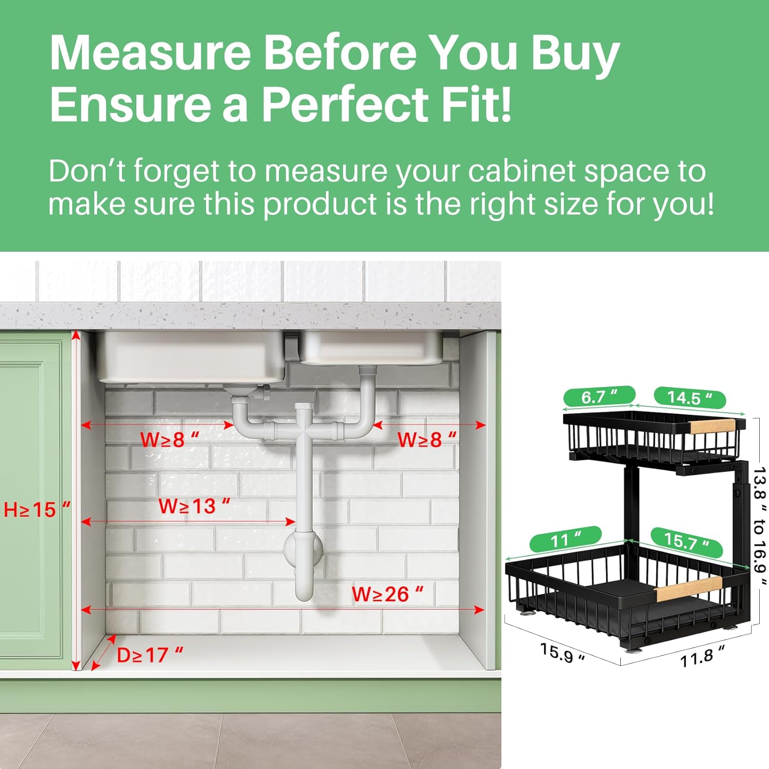 - Larger Organizer for Maximum Efficiency: This under sink organizer, measuring 11.8"W x 15.9"D x (13.8"-16.9")H, providing more capacity for storing taller bottles, cleaning supplies and other essentials.Before purchasing, please double-check your cabinet dimensions to ensure this under cabinet organizer fits properly.