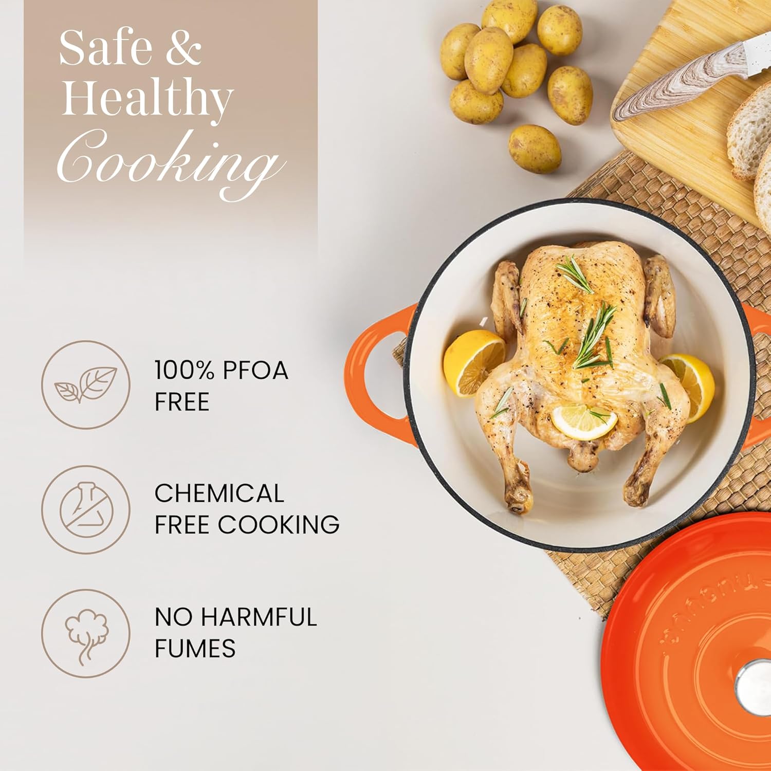 Nuovva Enamelled Cast Iron Dutch Oven Pot with Lid – 6.4 Quart Non Stick Casserole Pot – Heavy Duty & Oven Safe up to 500° F for Bread Baking, Braising, Stews, Roasting – 28cm Orange
