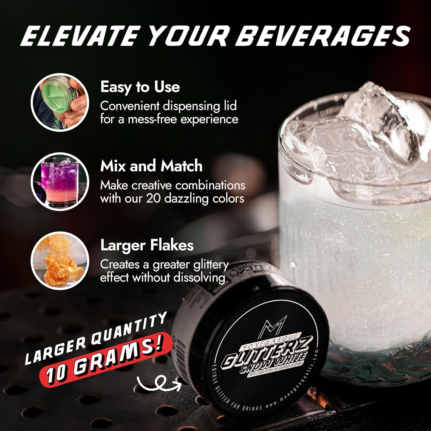 - PREMIUM EDIBLE GLITTER FOR COCKTAILS – Add a touch of glamour to your creations with MONÉGASQUE Glitterz. Perfect for cocktails, cakes, and more, our halloween glitter is flavorless and safe, crafted from mica-based pearlescent and food-grade colorants.
