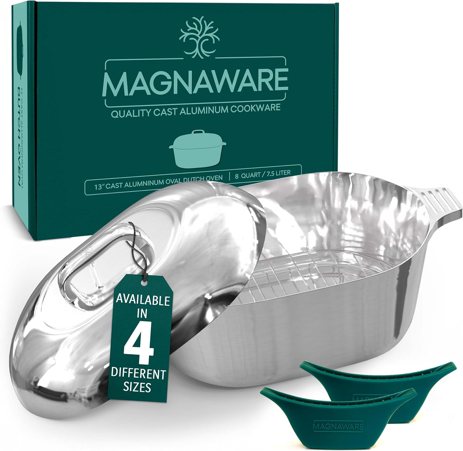 - BUILT TO LAST GENERATIONS: Constructed for durability, this heavy-duty cast aluminum pot is oven safe up to 450°F. MAGNAWARE dutch ovens feature a classic polished aluminum finish that complements any kitchen aesthetic. For best results, simply use a small amount of oil, and to preserve the surface, we recommend silicone, wood, or nylon utensils over metal ones.