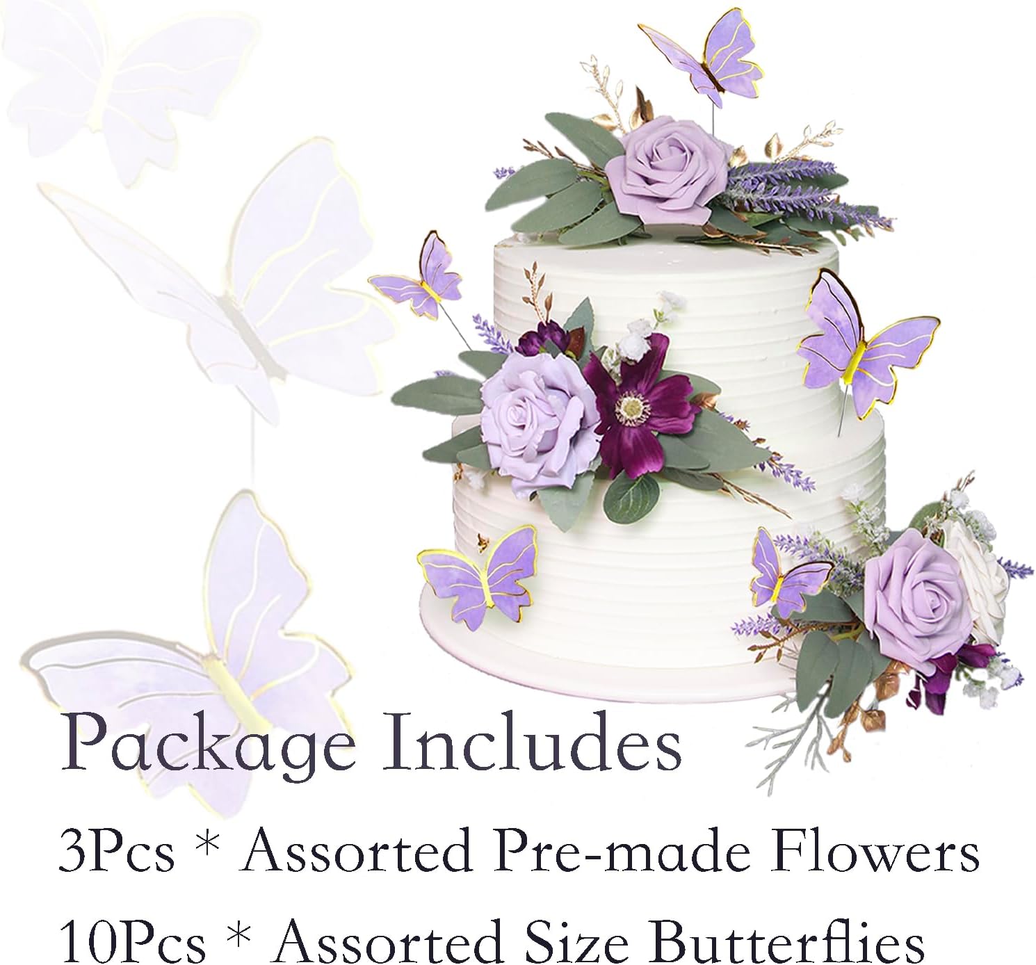 Rinlong 3Pcs Pre-made Purple Cake Flowers Decorations Flower Cake Topper Butterfly Cake Decorating Flowers for Wedding Sweet 16 Birthday Girl