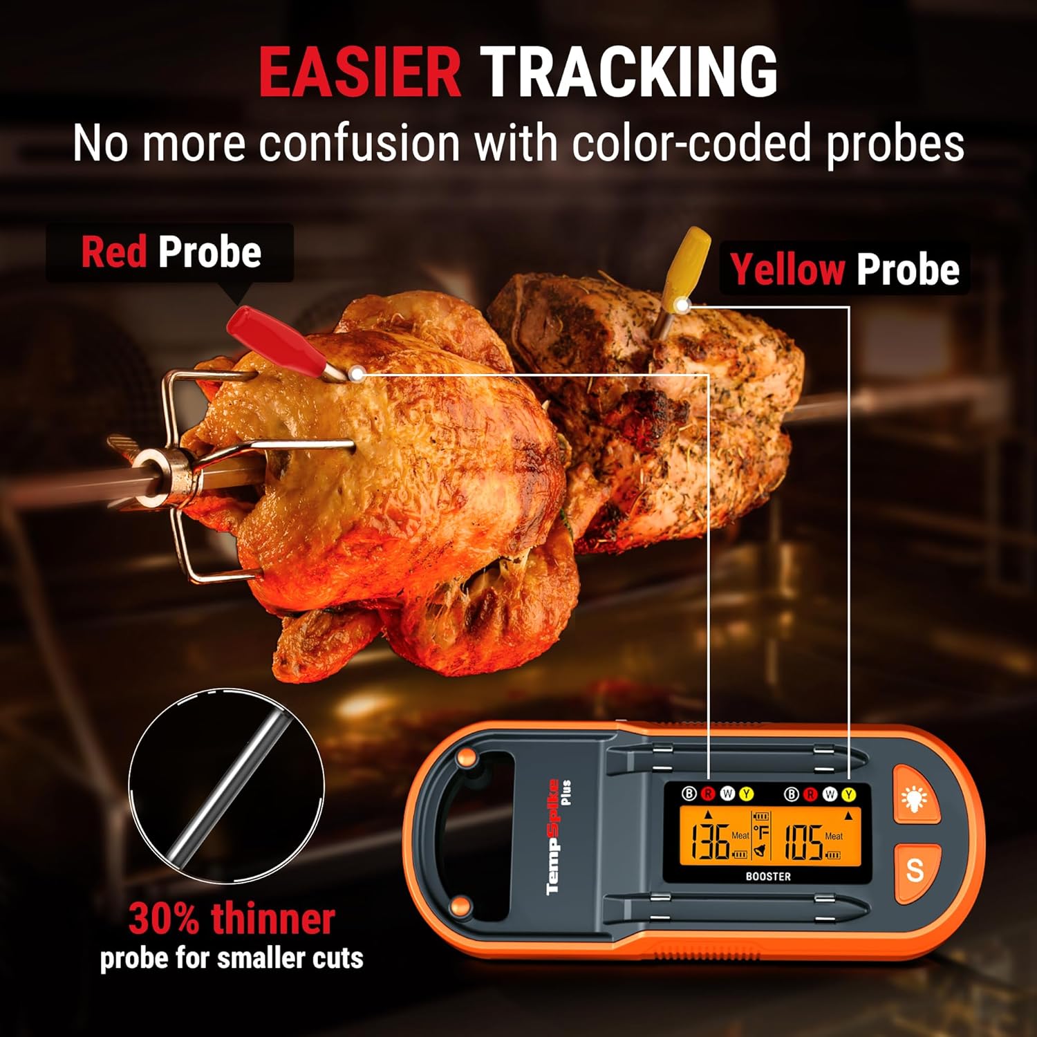 ThermoPro TempSpike Wireless Meat Thermometer with 2 Ultra-Thin Meats Probes, Bluetooth Meat Thermometer with Stand-Alone LCD Booster for BBQ, Oven, Grill, Kitchen, Smoker, Rotisserie, Red and Yellow