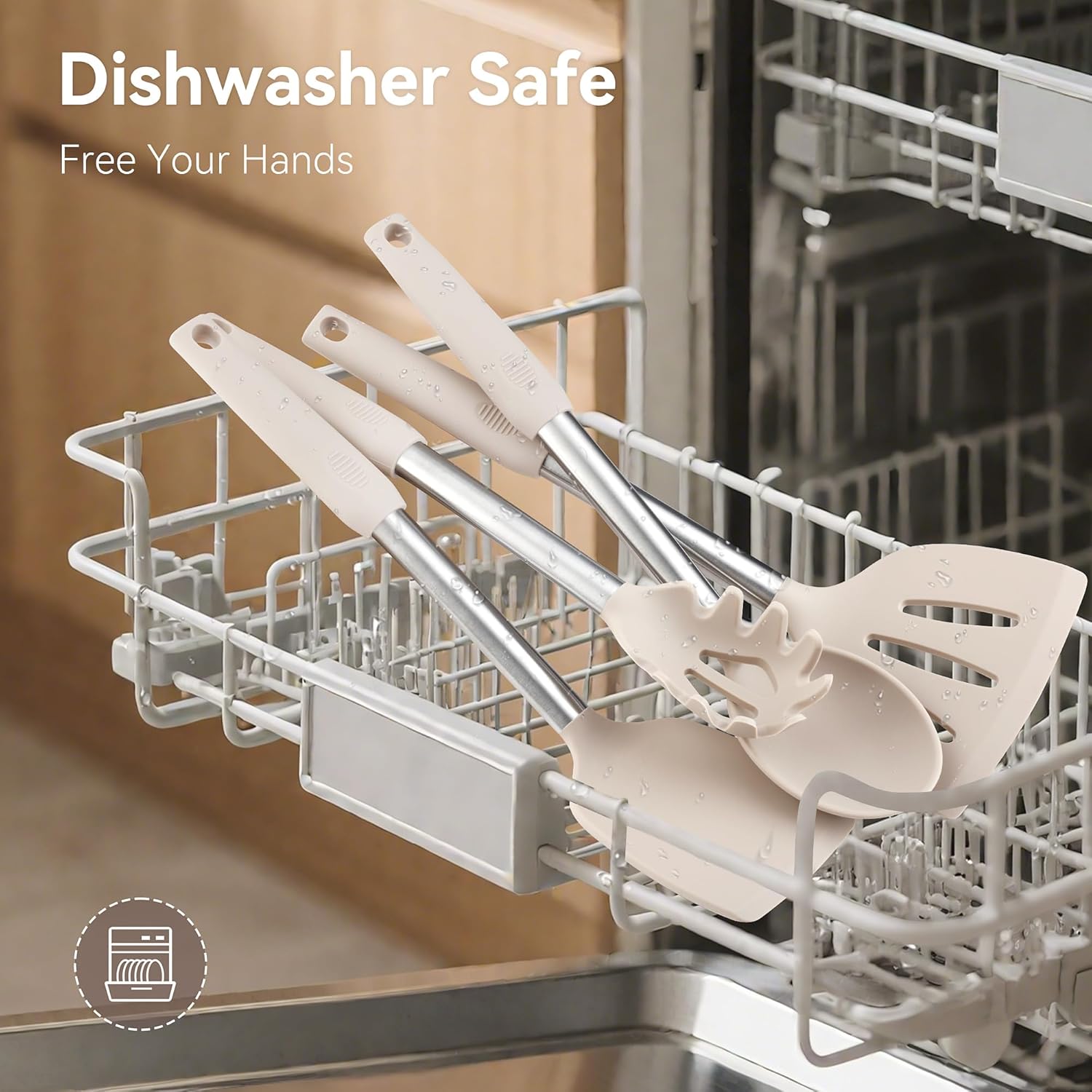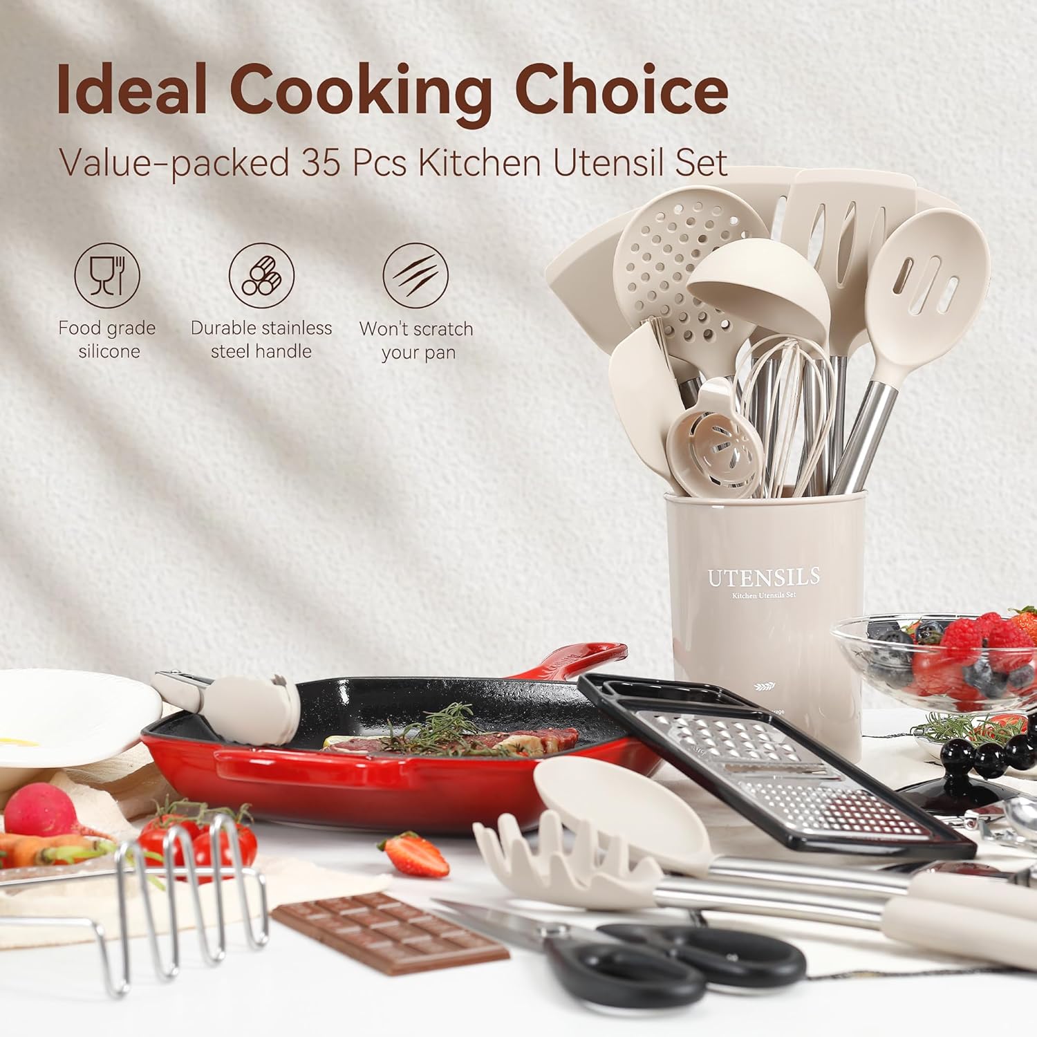 Silicone Cooking Utensils Set, NCUE 35 Pcs Kitchen Utensils Set with Holder, with Stainless Steel Handle Spatula Set, Spoons, Pasta Server, Cheese Grater, Masher, Scissors, Dishwasher Safe (Khaki)