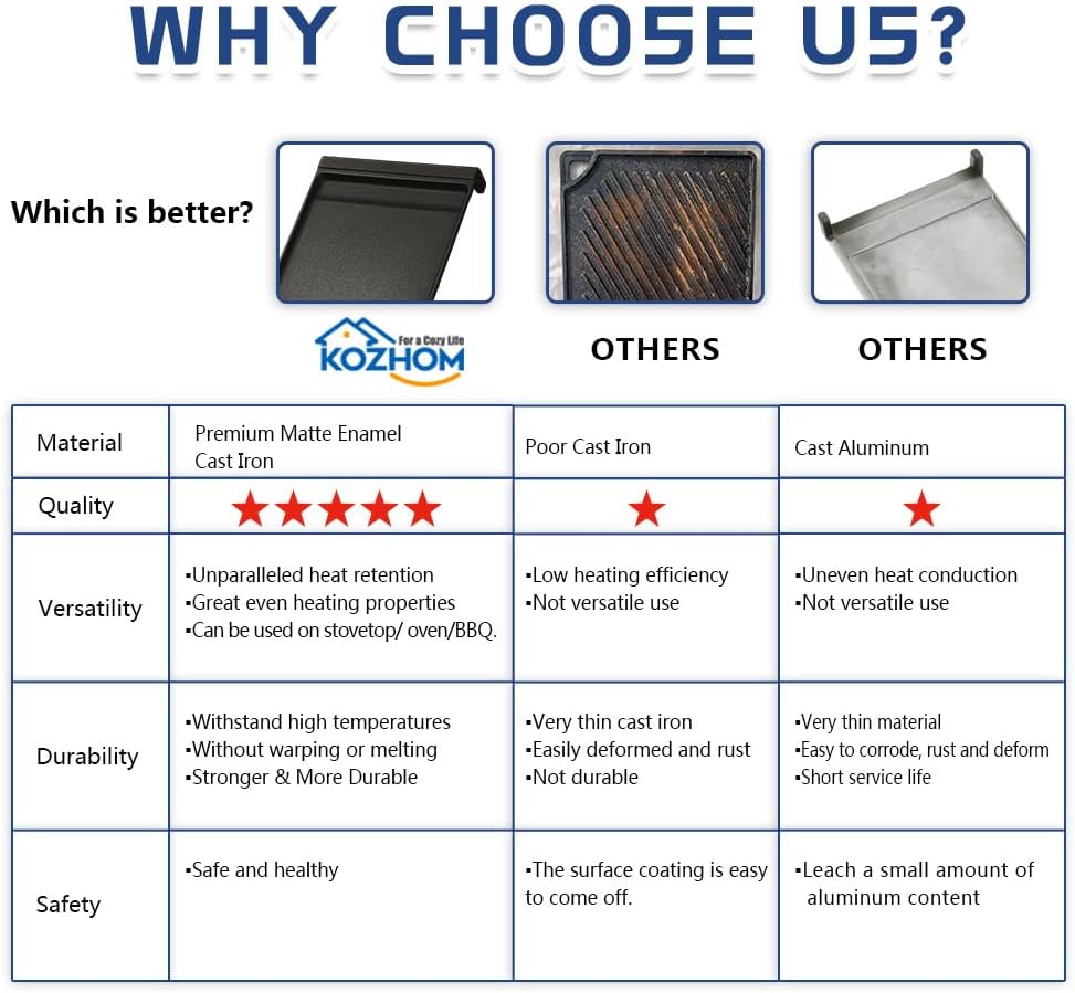 - β VERSATILE CAST IRON - Cast iron griddles are highly regarded for their unparalleled heat retention and even heating properties. Due to its strength and ability to withstand high temperatures without warping or melting, it is more durable than cast aluminum griddles. It can be used on your stovetop, in your oven and even on your BBQ.