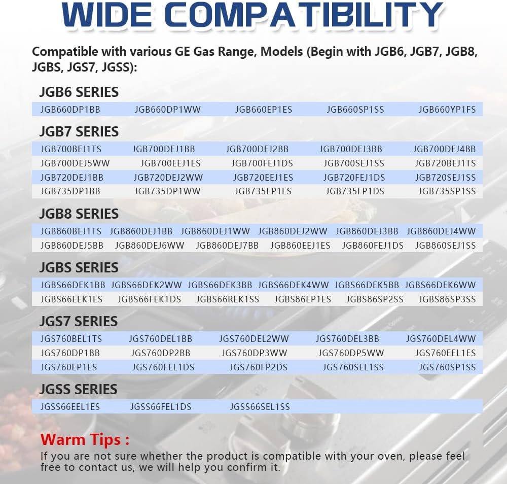- β IDEAL REPLACEMENT - This Gas Stove Top Griddle Plate is compatible with various GE gas range, models begin with JGB6, JGB7, JGB8, JGBS, JGS7, JGSS. Replaces part numbers: WB31X24738, WB31X24998, AP5986291, EAP11725207, PS11725207, 4322558. If you are not sure whether the product is compatible with your stove, please feel free to contact us, we will help you confirm it.