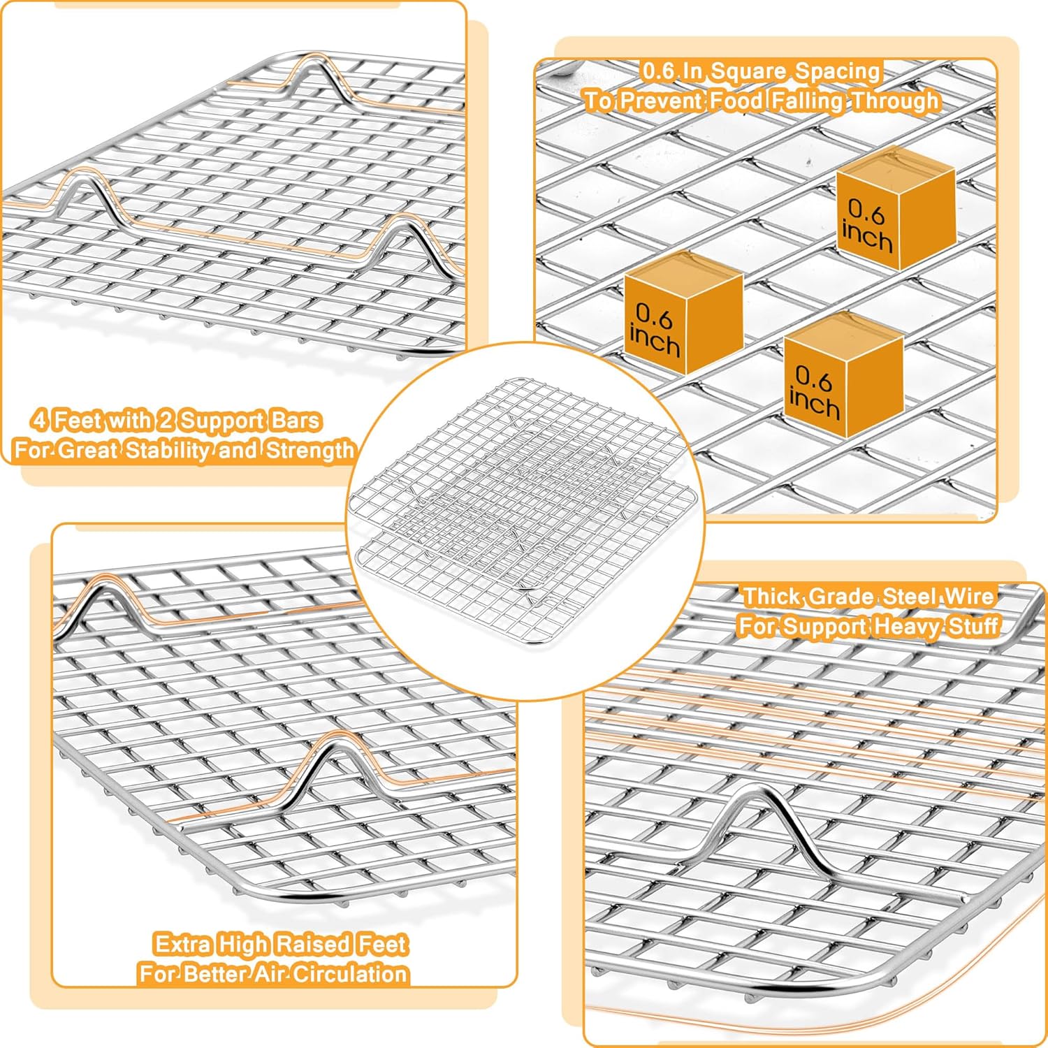 - Set of 4 & Multi-Use: Pack of 4, Included 2 baking tray sized 12.5 x 9.5 x 1 inch, 2 grid racks sized 11.75 x 9 x 0.75 inch, Enough for big meal or daily cooking needs, Ideal for baking crispy chicken / cookies, Roasting veggies / meat, Cooling cupcakes / bread, Draining grease / water, The baking rack not only be used with cookie pan, But also can hold and cool the food separately after baking
