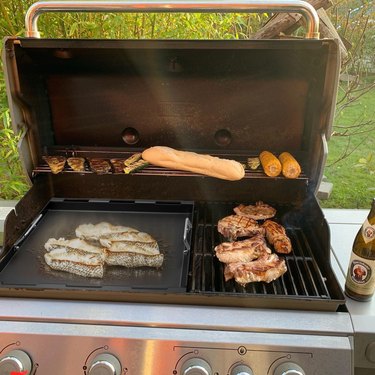 - 【Huge Cooking Area】Griddle Dimension: 18.75 x 22.2 inches, Grate Dimension: 18.75 x 11.2 inches, 18.75 x 33.45 inches for total. Cooking steaks, pasta, vegetables, potatoes, stir fry as you like and enjoy the barbecue, meet the needs of simultaneous use of Griddle and Grate. Make sure you measure the size of your grill and compare with ours before you order.
