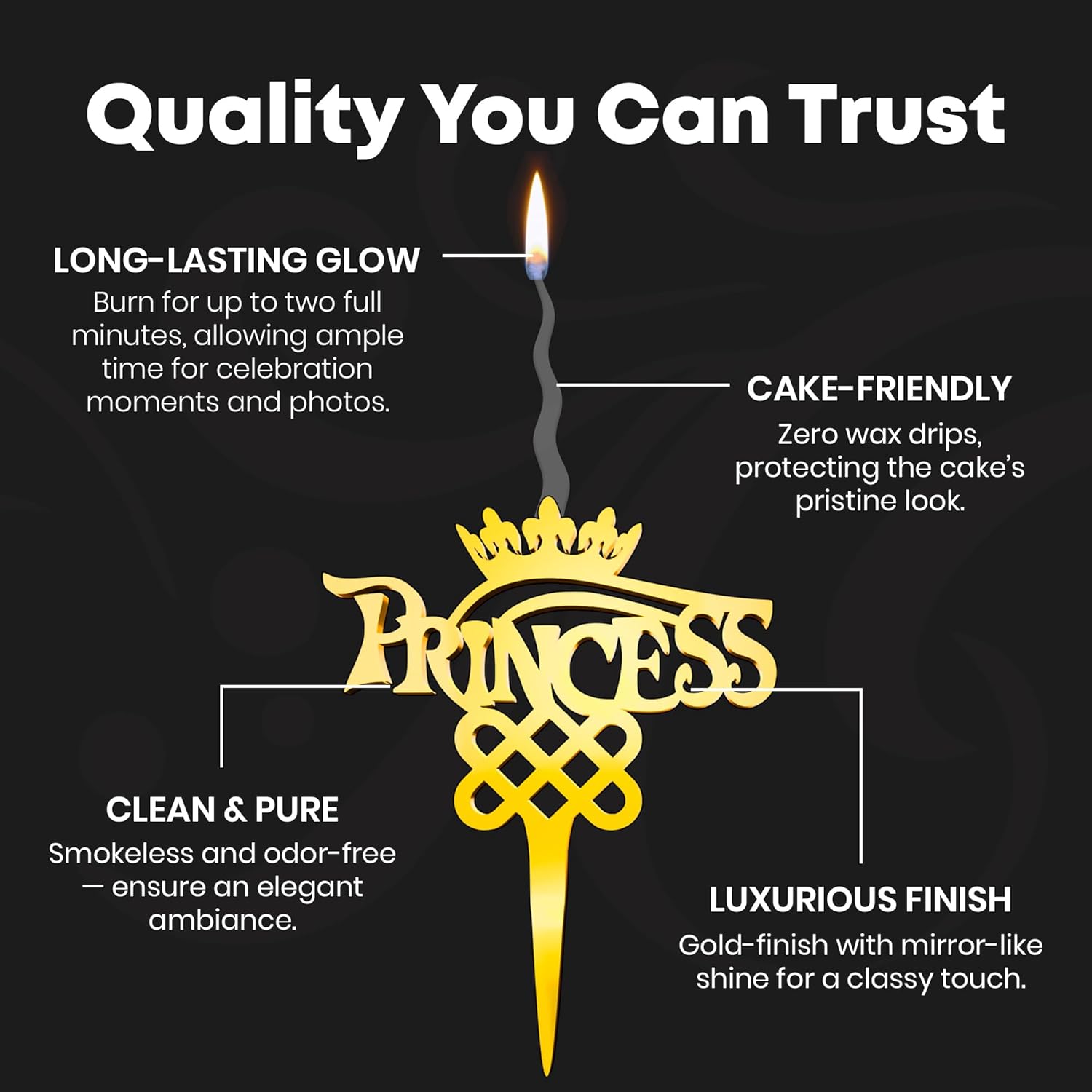 - Add Elegance to Your Celebration: This luxury cake topper candle is designed to instantly elevate your celebrations. With its premium gold glitter finish, this candle becomes the focal point on birthdays, weddings, and anniversaries. Whether it's a first birthday or a golden anniversary, let this striking centerpiece make your event unforgettable.