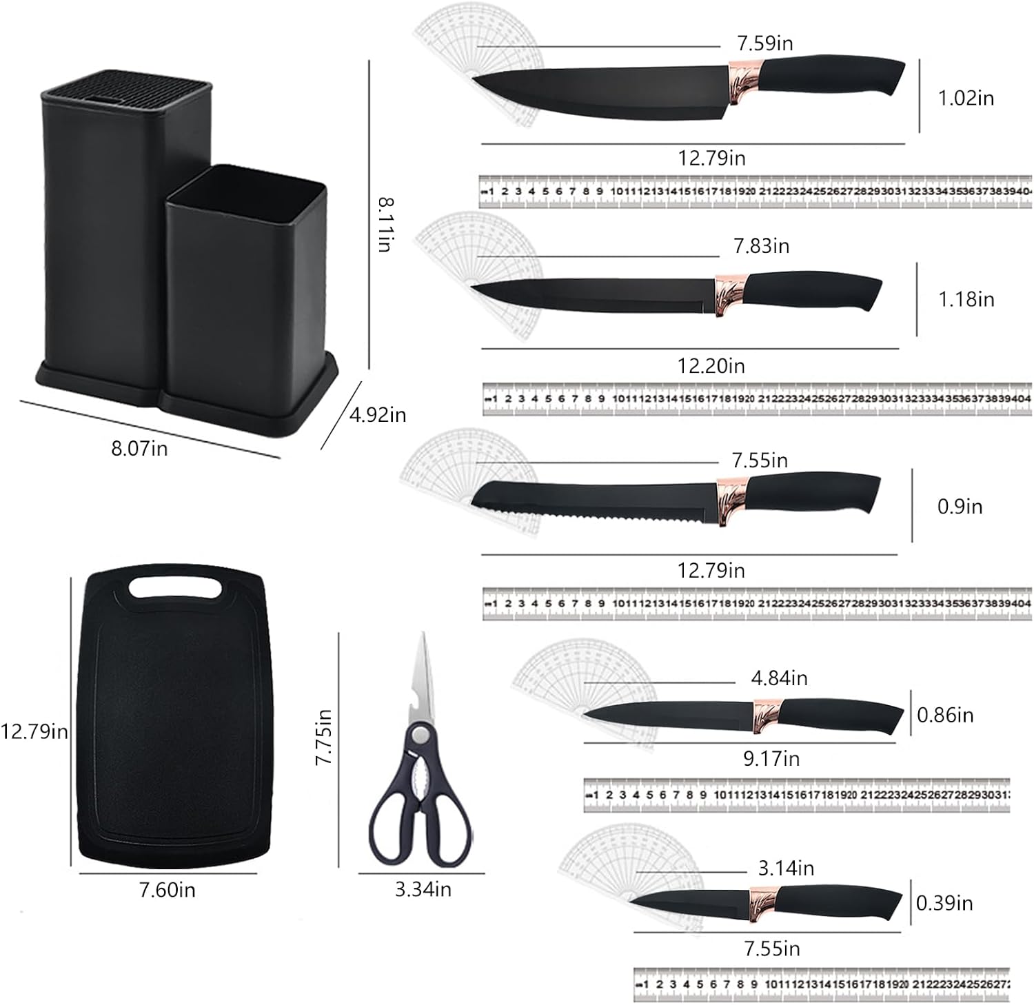 - 6-IN-1 KNIVES SET: the set includes a 12.8-inch serrated bread knife, 11.8-inch chef's knife, 11.8-inch slicing knife, 9.25-inch utility knife, 7.6-inch fruit knife, kitchen shears, and a knife holder for storing kitchen utensils Block.
