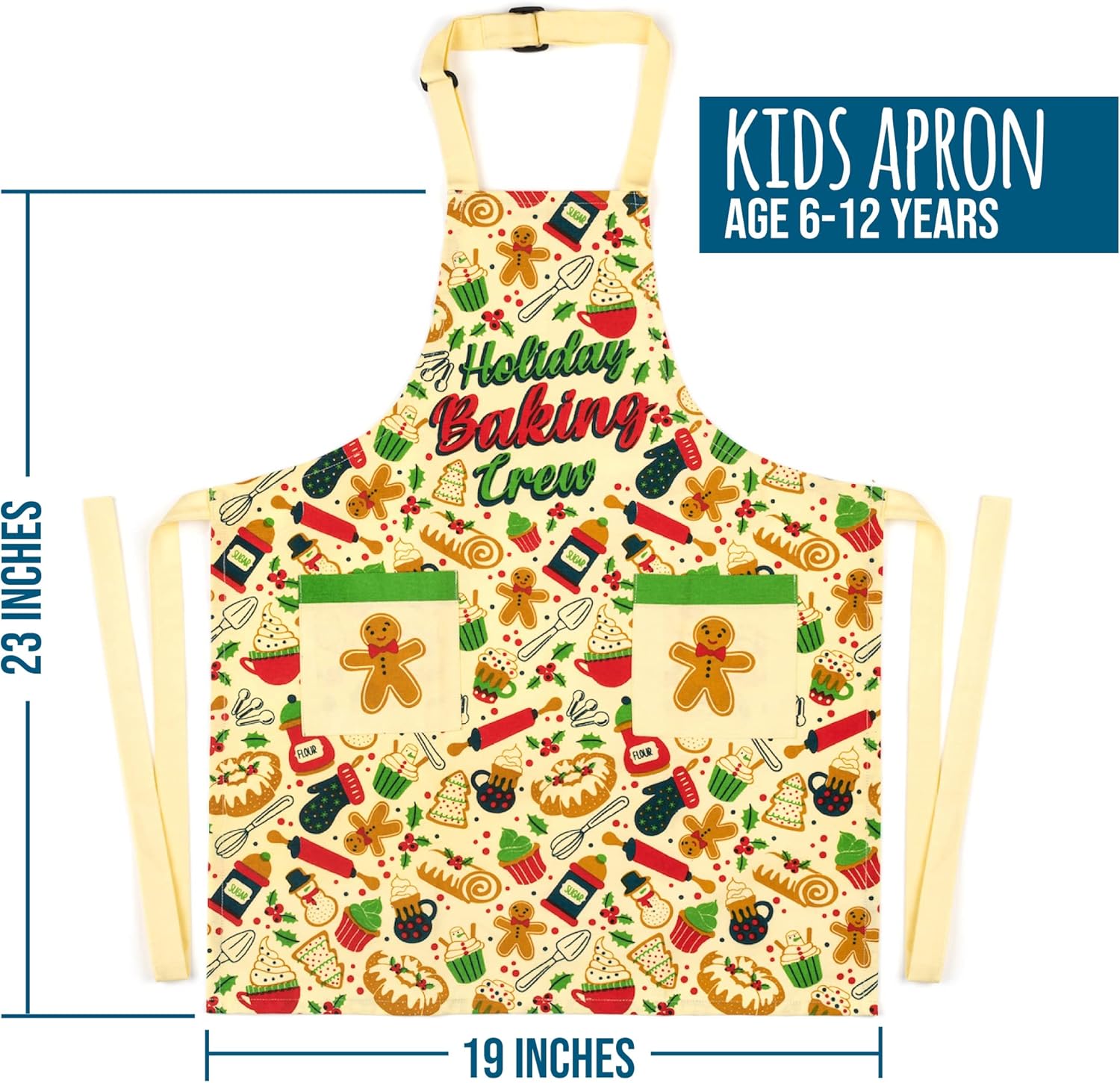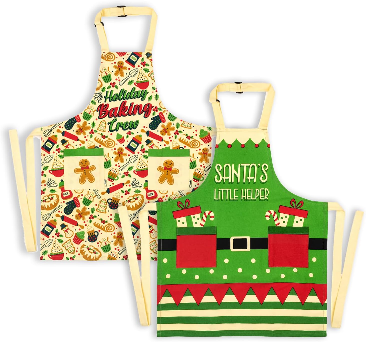 - KIDS HOLIDAY APRONS 2 PACK: Features two unique designs - one with the fun phrase "Holiday Baking Crew" and the other with "Santa's Helper". These eye-catching designs will make your little ones feel extra special during holiday baking sessions.