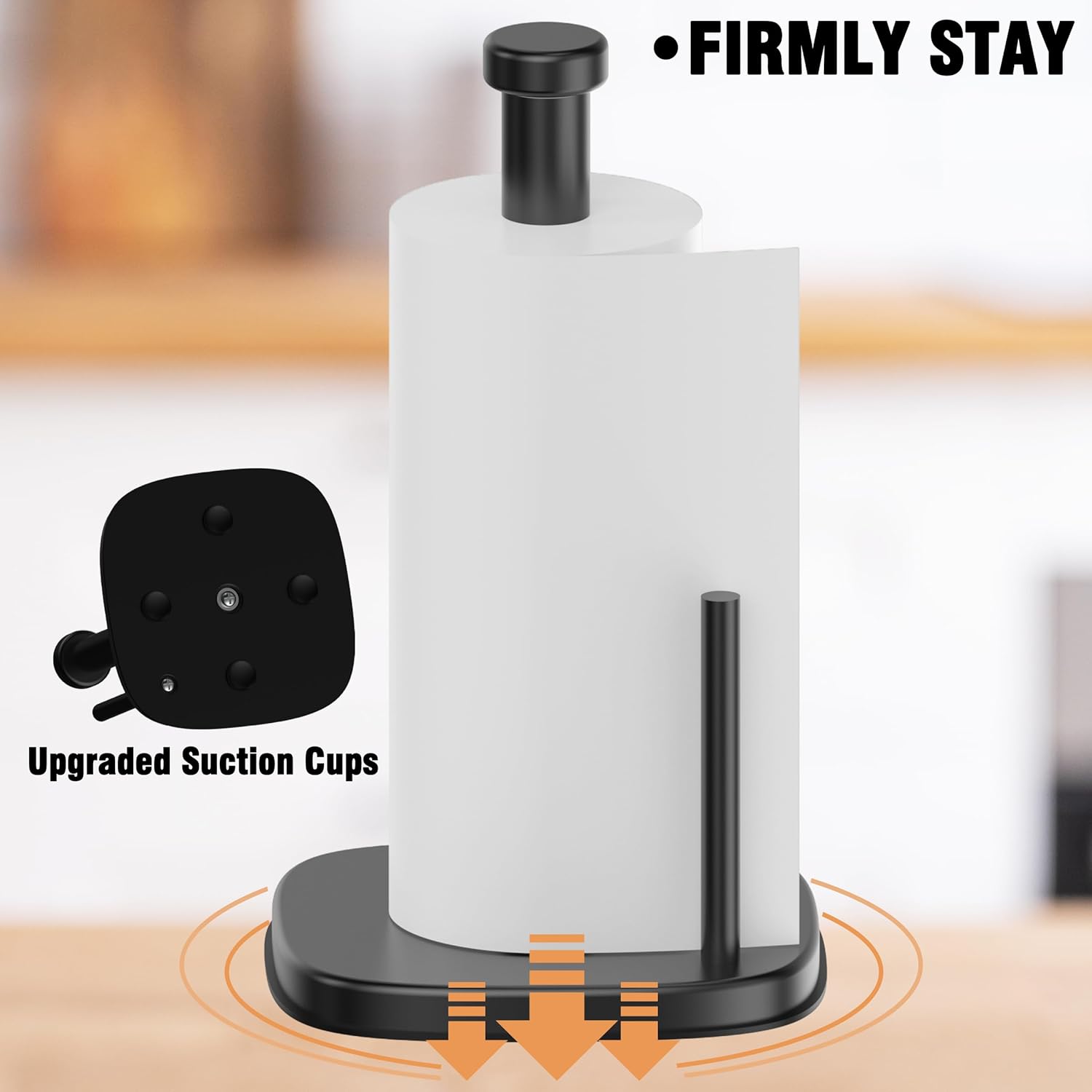 Paper Towel Holder Countertop, Standing Paper Towel Roll Holder for Kitchen Bathroom Organize, Stand with Weighted Base Suction Cups, Stainless Steel One-Handed Operation (Matte Black)