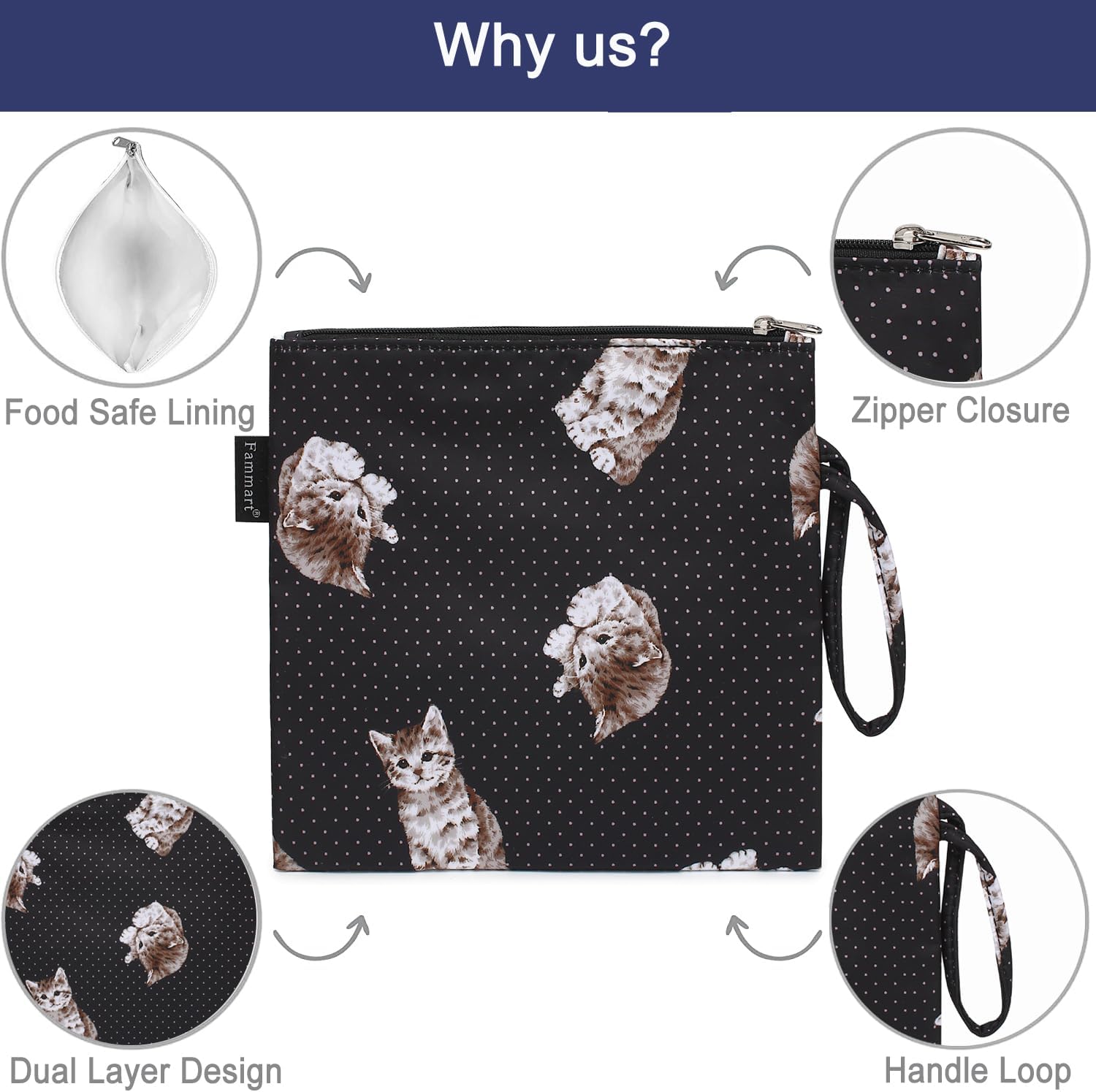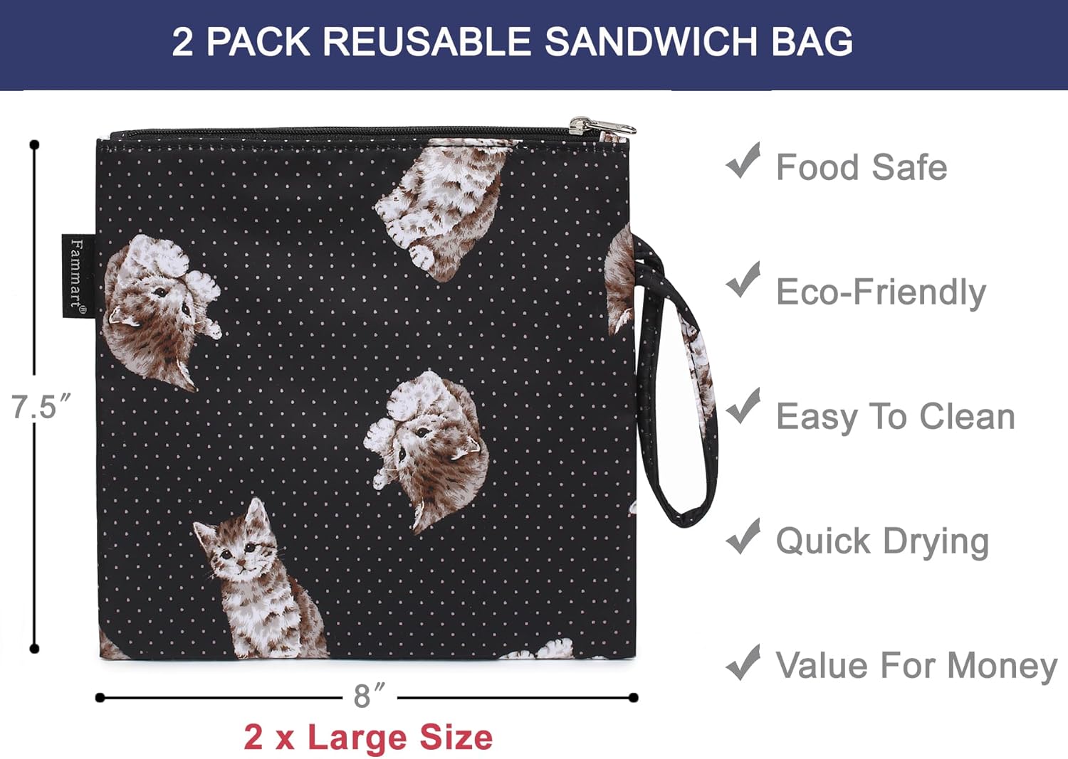Reusable Sandwich Bag/Snack Bag for Kids & Adults, Dual Layer Lunch Bag with Handle, Washable, Food Safe, BPA Free (2-Pack, Dot&Cat)