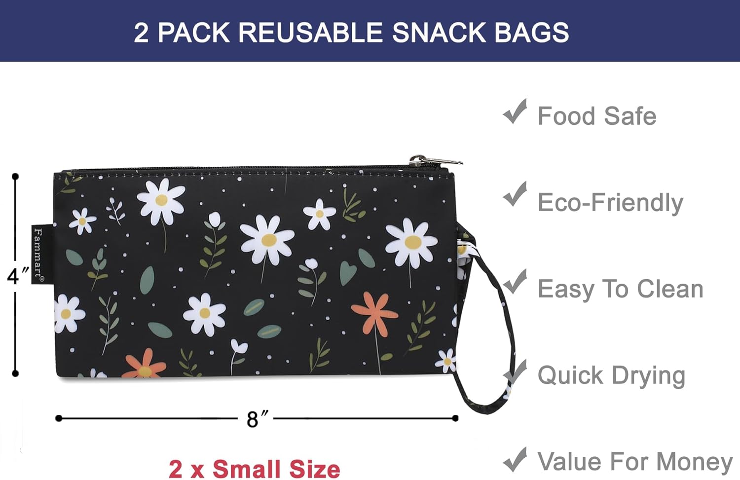 Reusable Sandwich Bag/Snack Bag for Kids & Adults, Dual Layer Lunch Bag with Handle, Washable, Food Safe, BPA Free (2-Pack, Daisy)