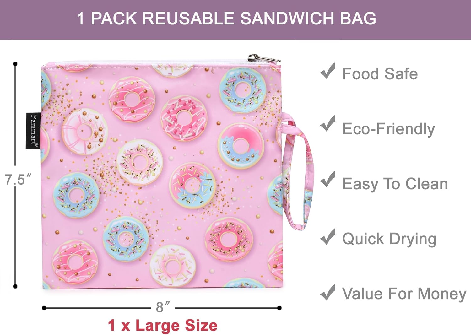Reusable Sandwich Bag/Snack Bag for Kids & Adults, Dual Layer Lunch Bag with Handle, Washable, Food Safe, BPA Free (1-Pack, Colorful Donut)