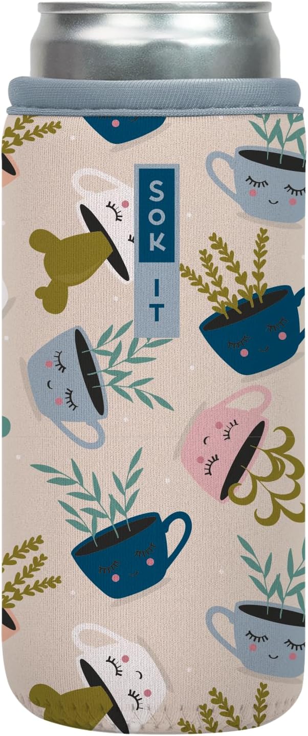 Sok It CanSok Sleeve for Beer & Soda Insulated Neoprene Cover (Botanical Teacups, 12oz Slim Can Sleeve)