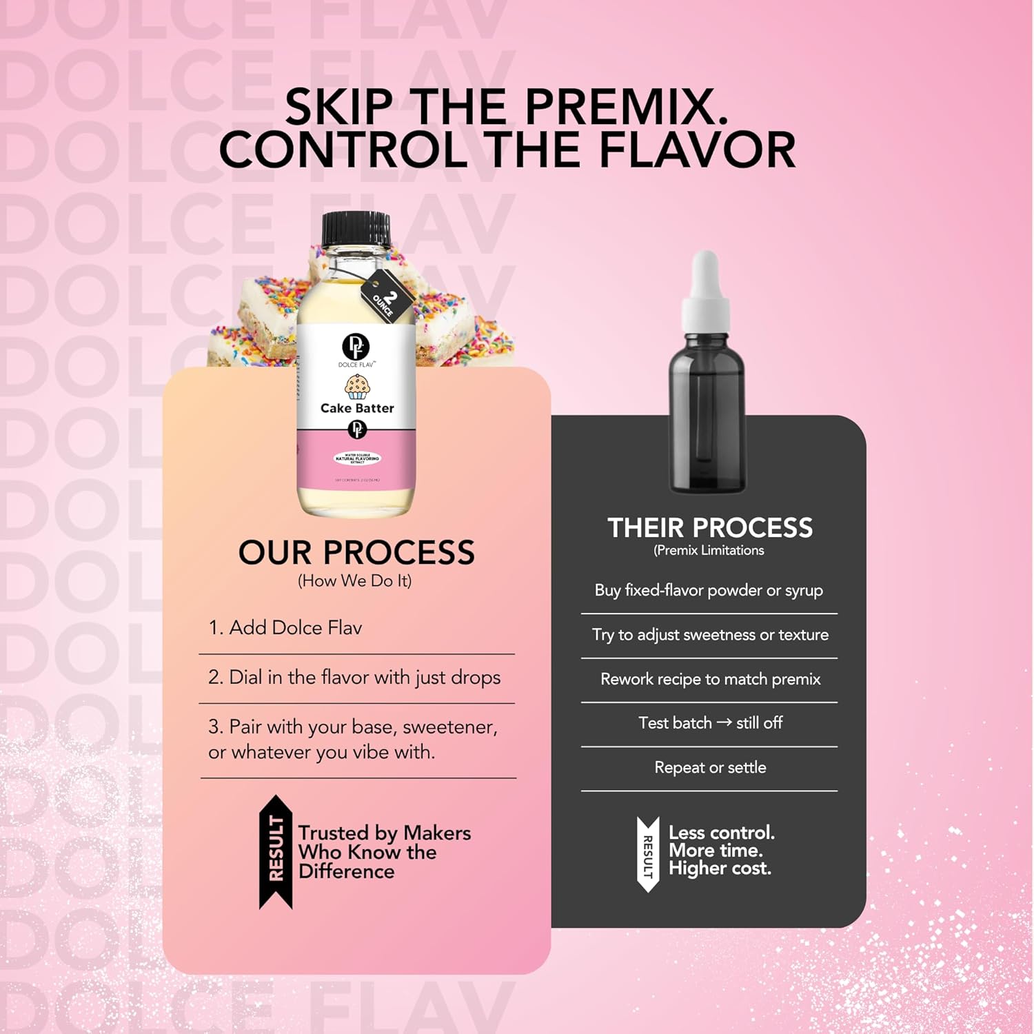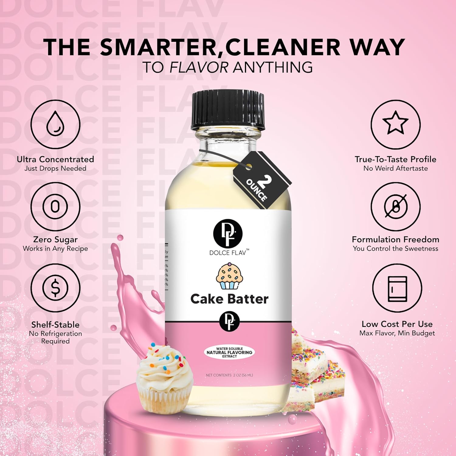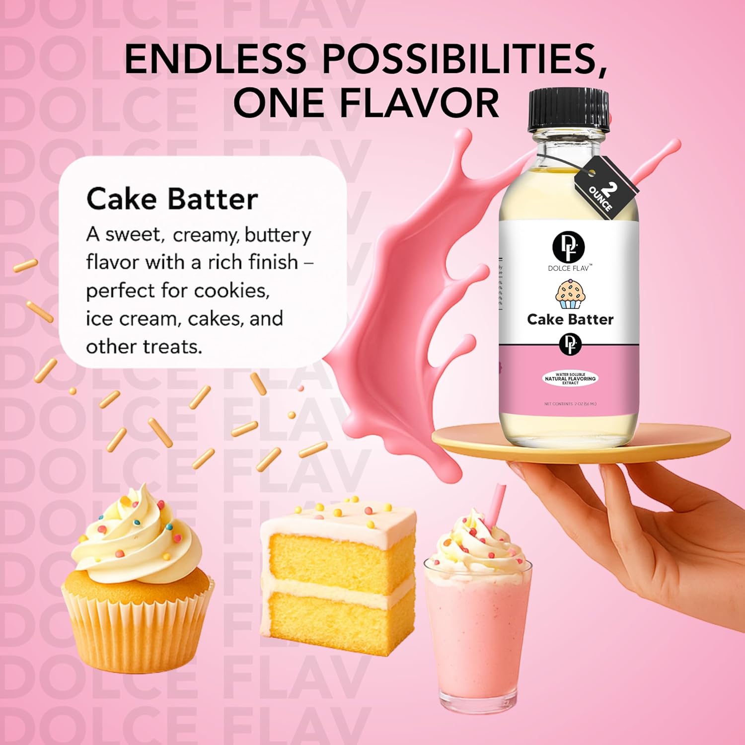 - Pure Cake Batter Extract for Baking Brilliance: Elevate your baking with our cake batter flavoring. Perfect for infusing a rich, nostalgic cake flavor, this key ingredient brings a delightful cake batter essence to everything from cookies to sumptuous frostings. Ideal for creating unique desserts like cake batter-flavored cake mix and shortcake.