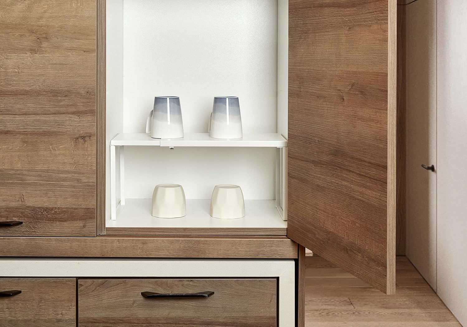 Nxconsu Cabinet Shelf Expandable Organizer Riser Rack for Kitchen Pantry Cupboard Under Sink Countertop Home Organization Extra Storage Space Saver Heavy Duty Metal Edgeless Design White