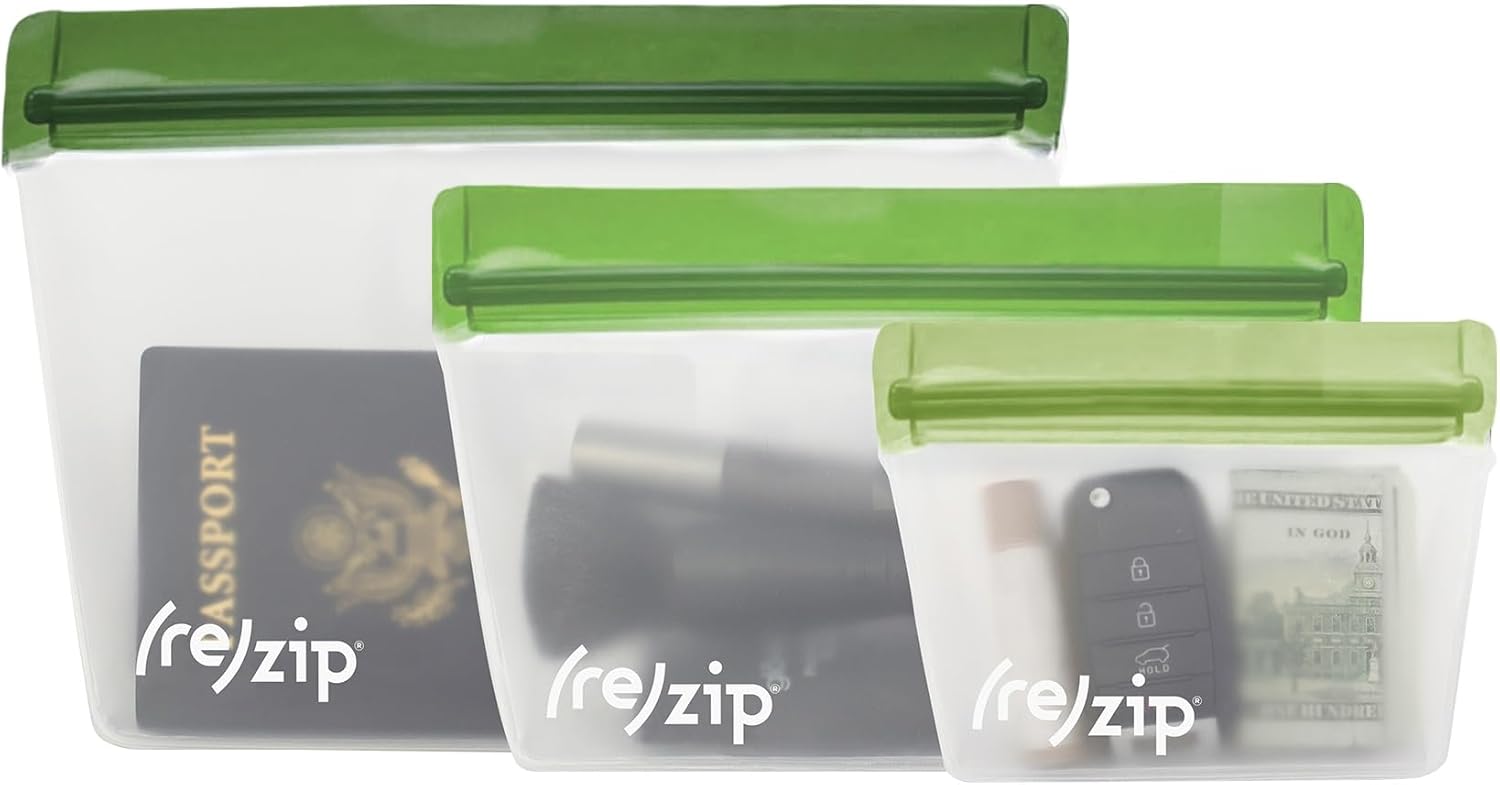 (re) zip 3-Piece TSA-Compliant Travel Bags | Stand-Up Style, Leakproof Storage for Toiletries, Cosmetics, Electronics, Snacks, Carry-On Organization | Quart (1), 2-Cup (1), Snack (1)