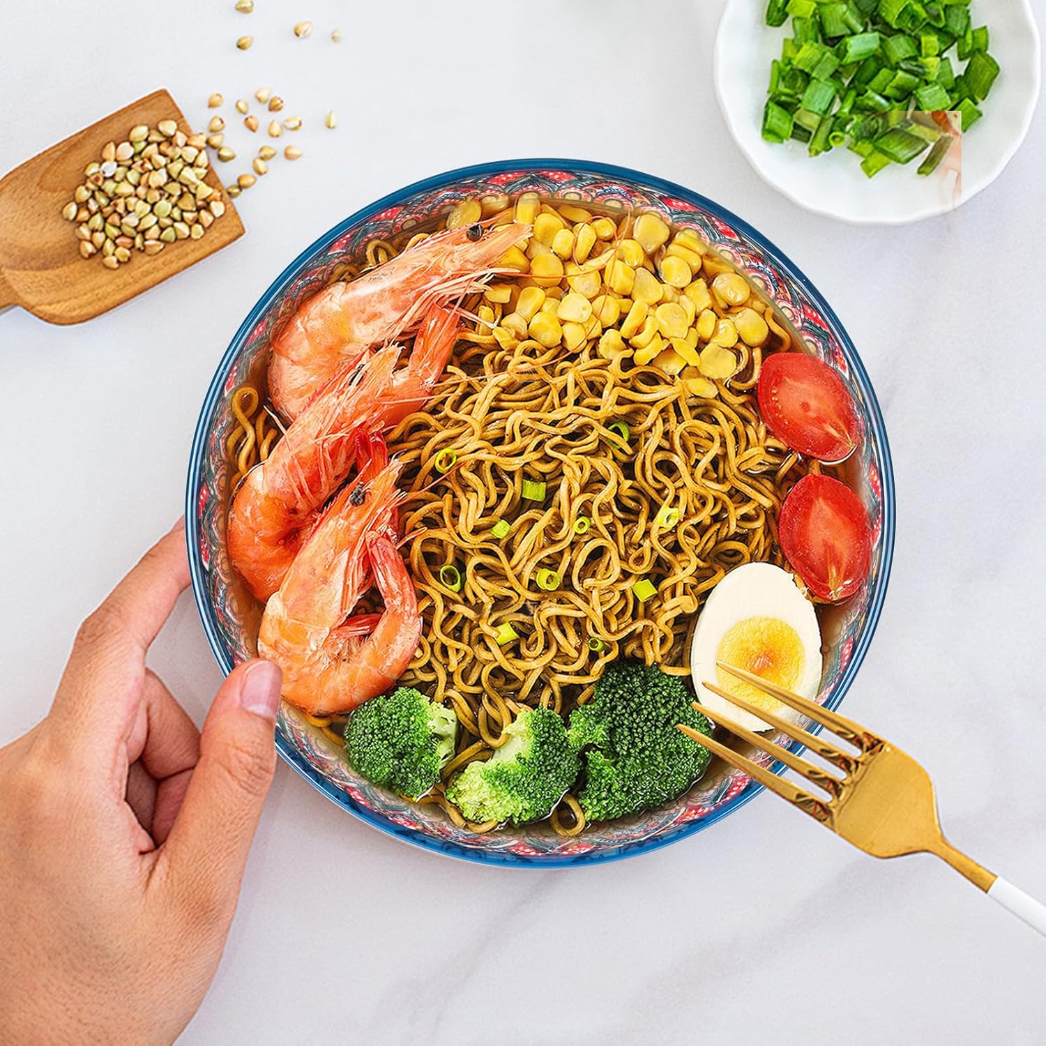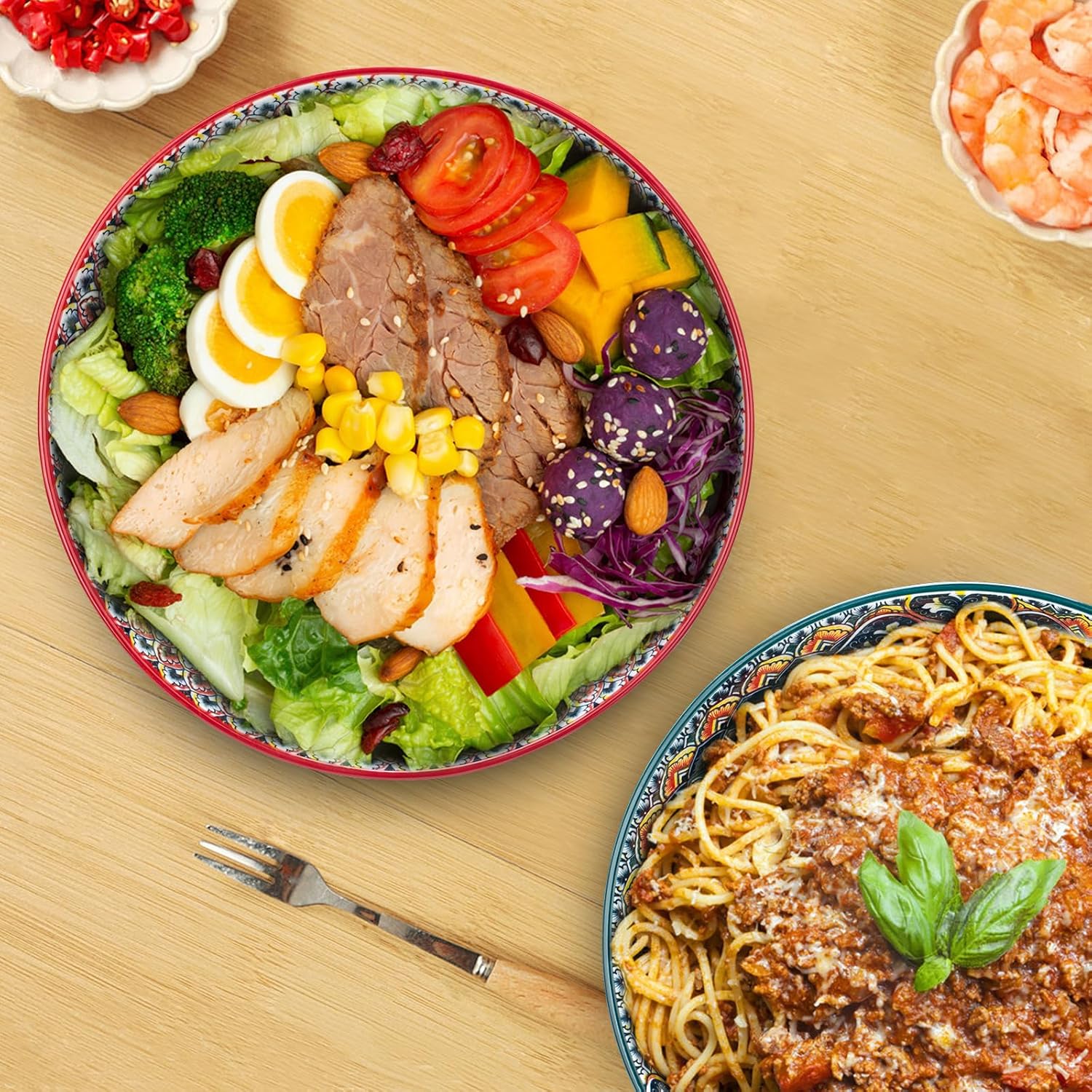 75 Oz Serving Bowls,Bohemian Style Large Porcelain Dishes for Entertaining Parties,Big Bowls for Eating Soup, Salad, Pasta, Fruit, Chips, 10.3 Inch Diameter (blue.red)