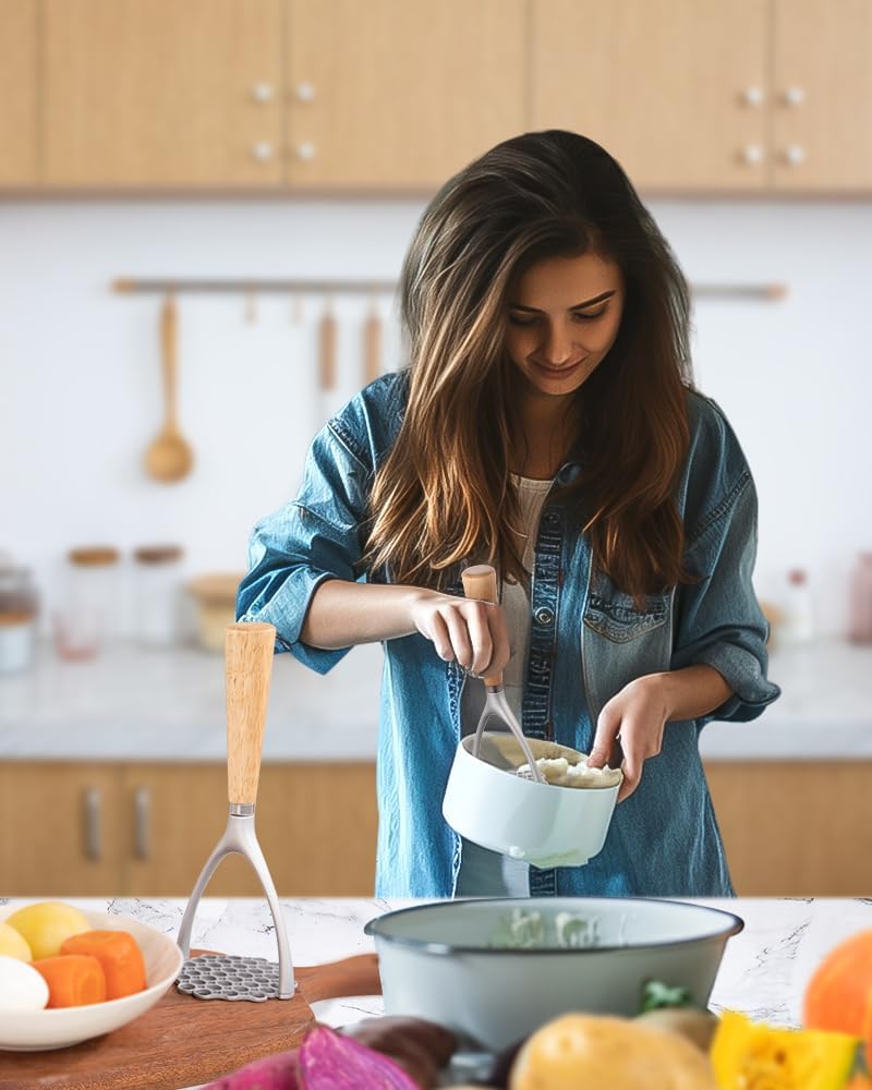 Brigii Potato Masher with Wooden Handle, Manual Potato Press for Kitchen Tool, Aluminum Alloy Potato Ricer For Fluffy Mashed Potato