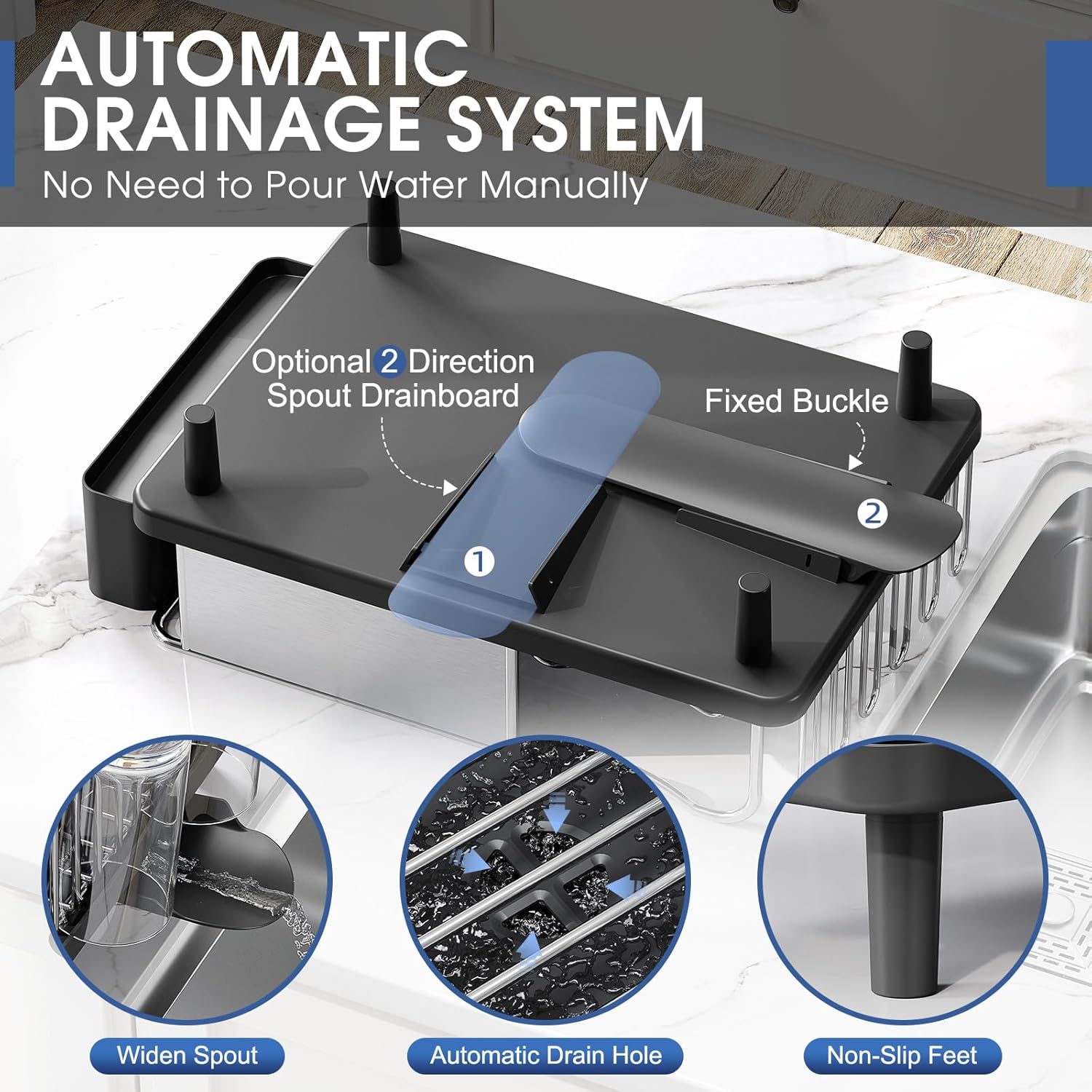 - Customizable Draining: The dish drainer is designed as a draining tray with 2 selectable direction spout to collect water from the rack. You can put it on the right or left side the sink at your choice.
