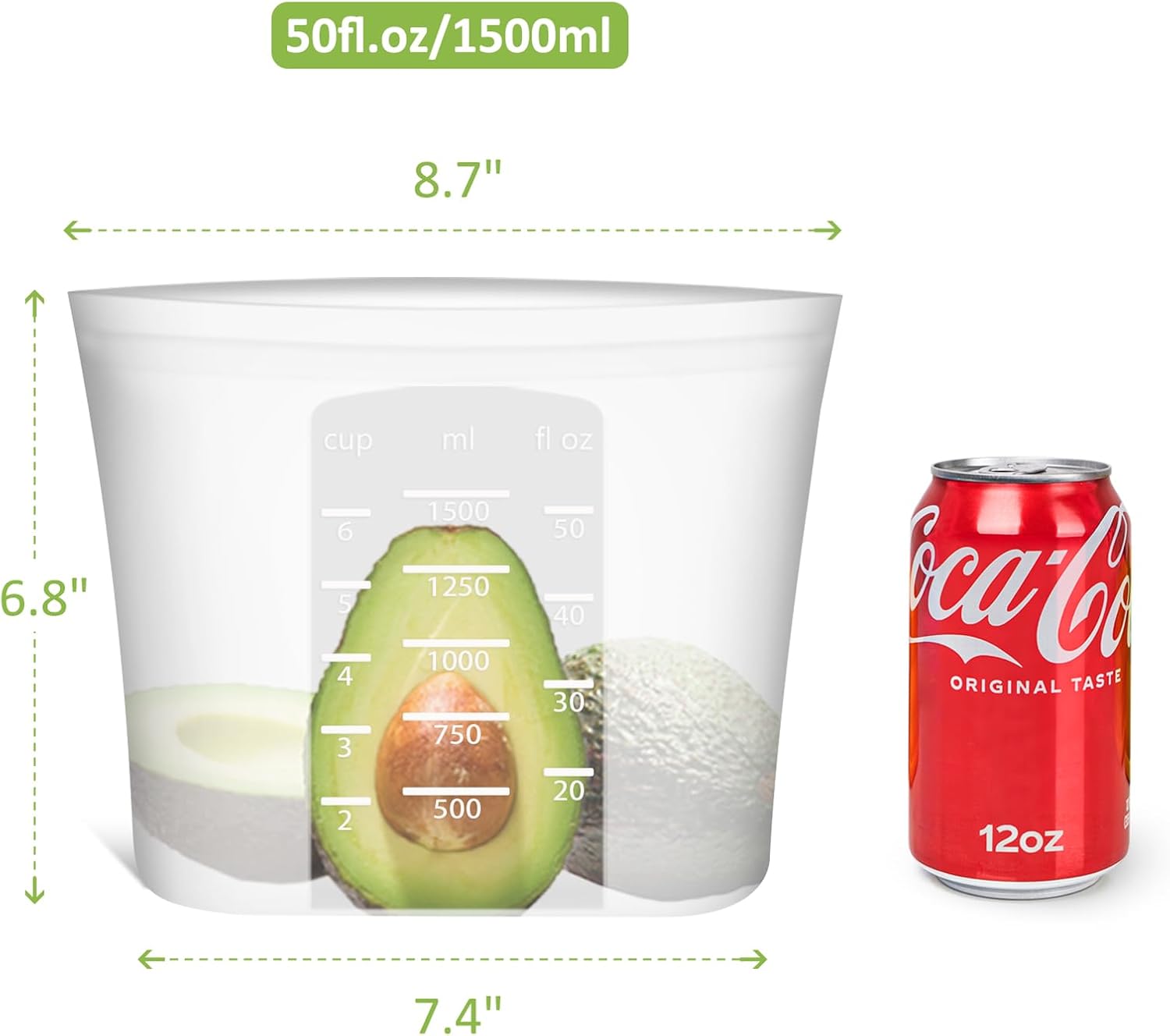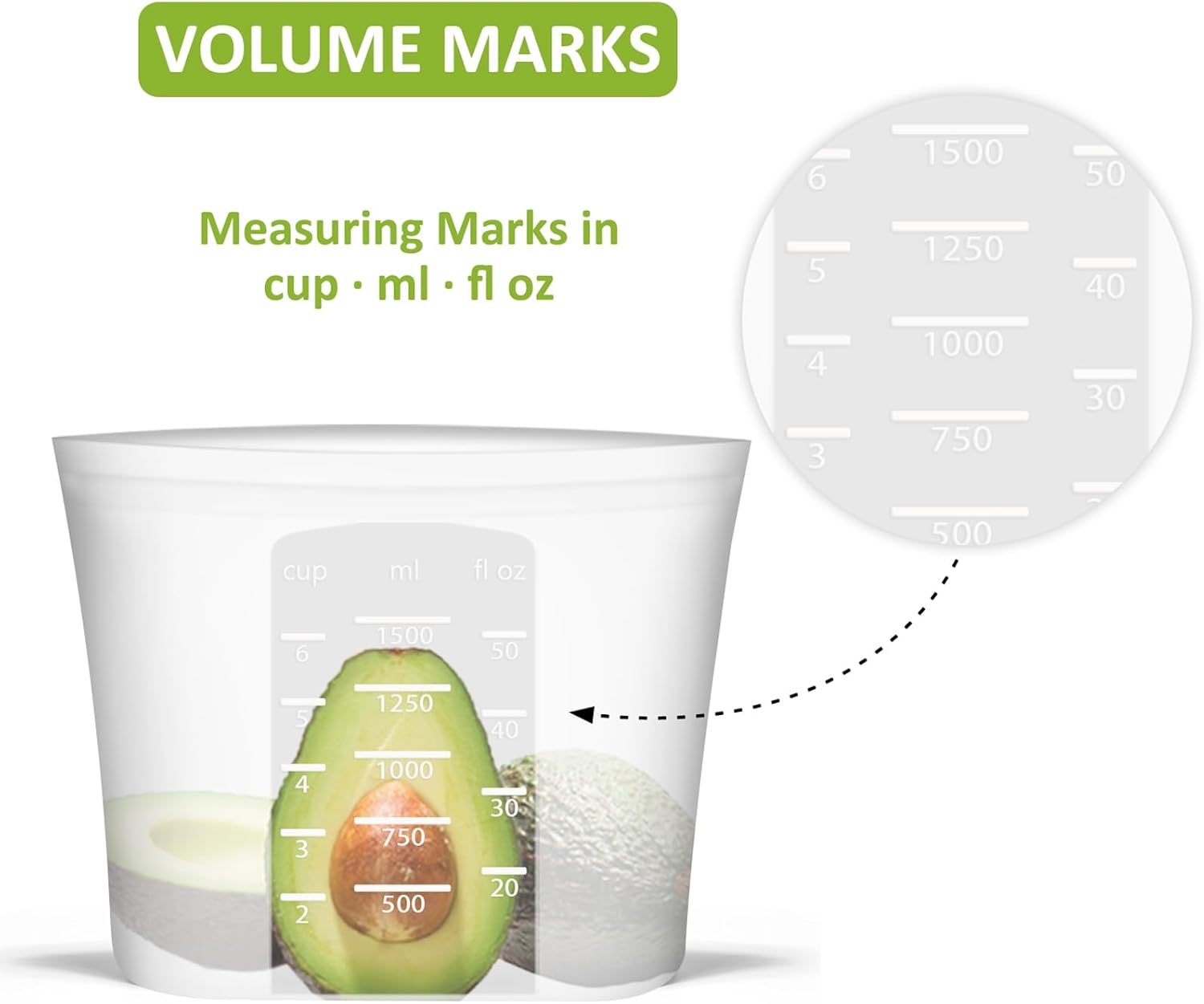 - ăTHOUGHTFUL & ECONOMICALăMedium size: 1.5quart/50.7fl.oz/1500ml. This reusable zip bag for food clearly marked measurements in cups, ml, and fl oz for easy use. Translucent body offers a glimpse inside. Robust construction ensures strength. One silicone bag can replace 300+ single-use plastic bags, saving money and creating a waste-free world