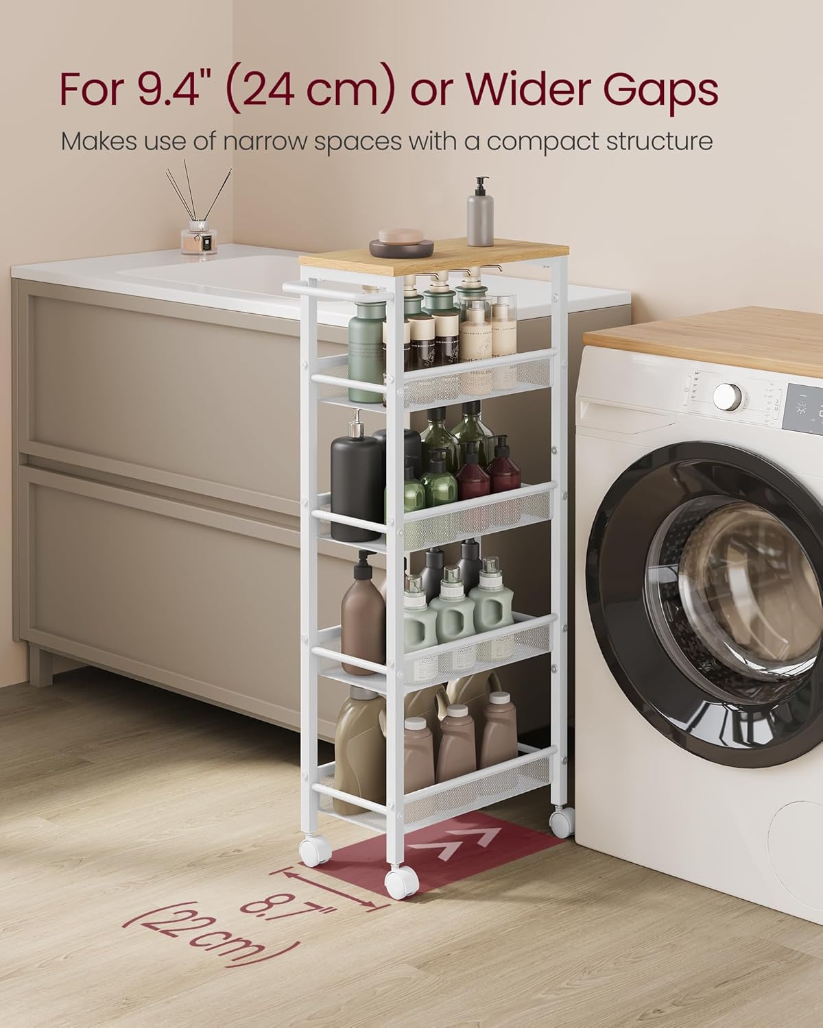 VASAGLE Slim Rolling Cart, 5-Tier Storage Cart, Narrow Cart with Handle, 8.7 Inches Deep, Metal Frame, for Kitchen, Dining Room, Living Room, Home Office, Oak Beige and Classic White ULRC035W09