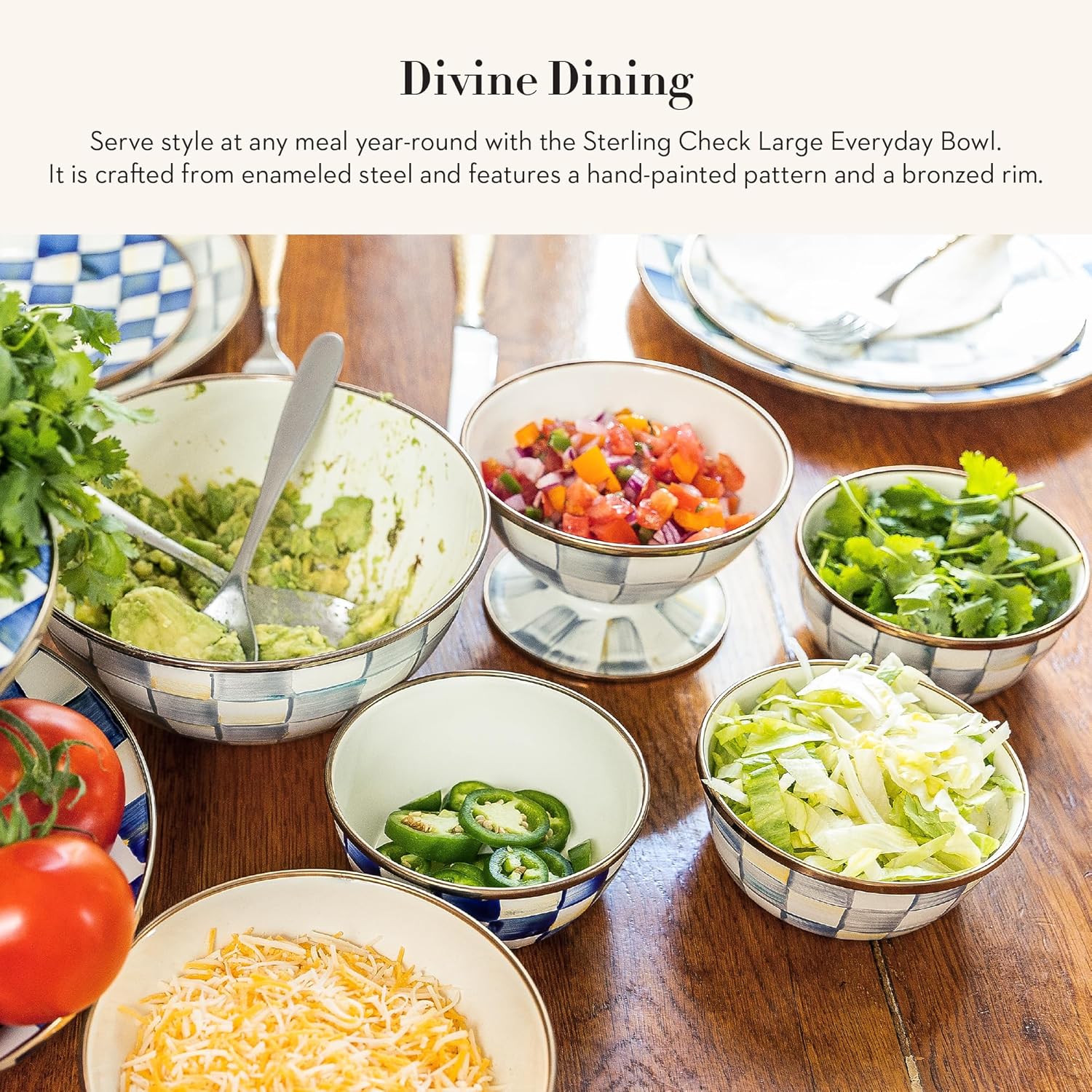 - ELEGANT ESSENTIAL: Elevate any meal with this decorative bowl. It has a hand-glazed heavy-gauge steel underbody and a bronzed stainless-steel rim and is decorated with hand-painted gray-and-white checks.