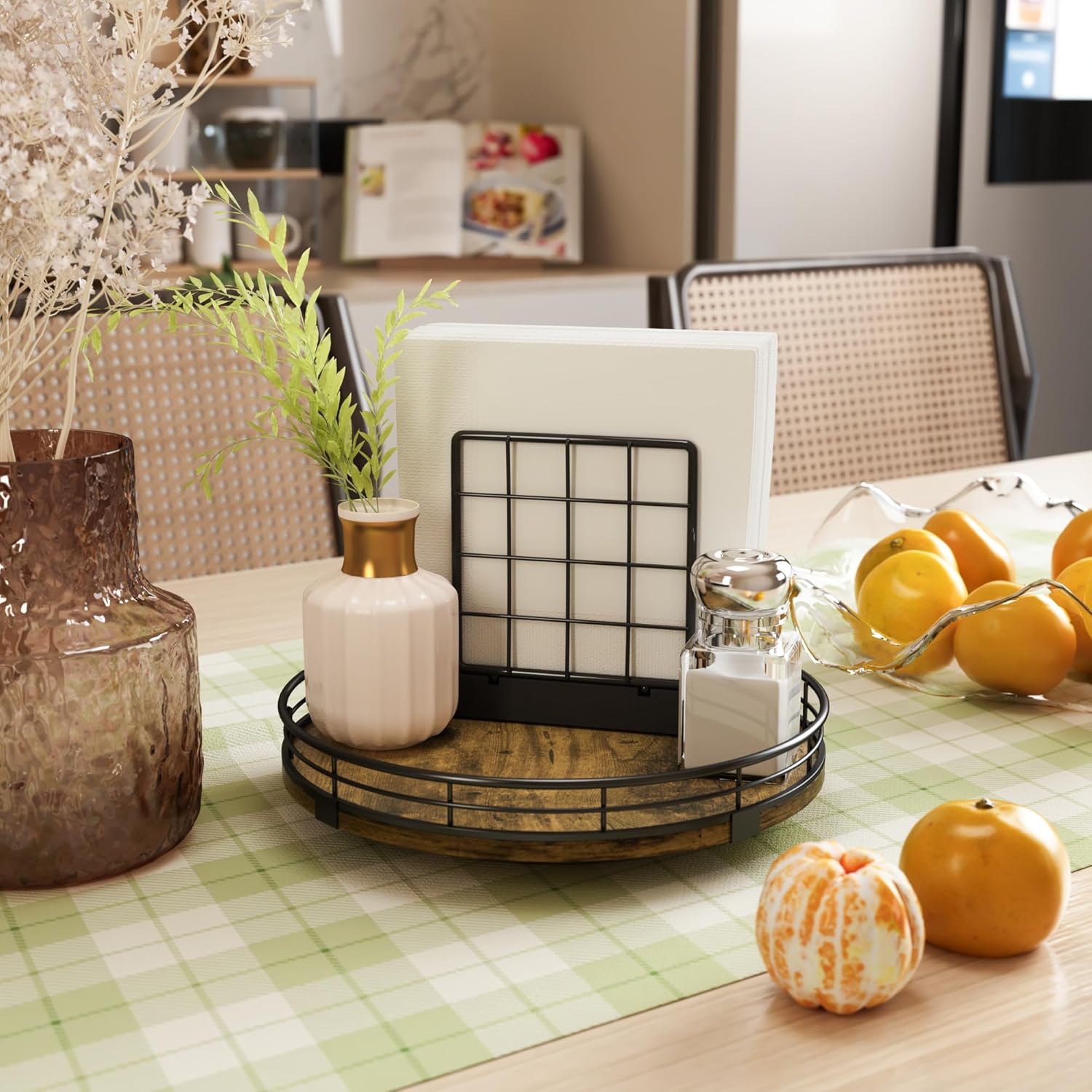 - Exquisite Texture-The lazy susan organizer adopts handmade craftsmanship. Its MDF material is strong and durable, not easy to wear and has no odor. The surface has exquisite texture, creating a unique rustic style