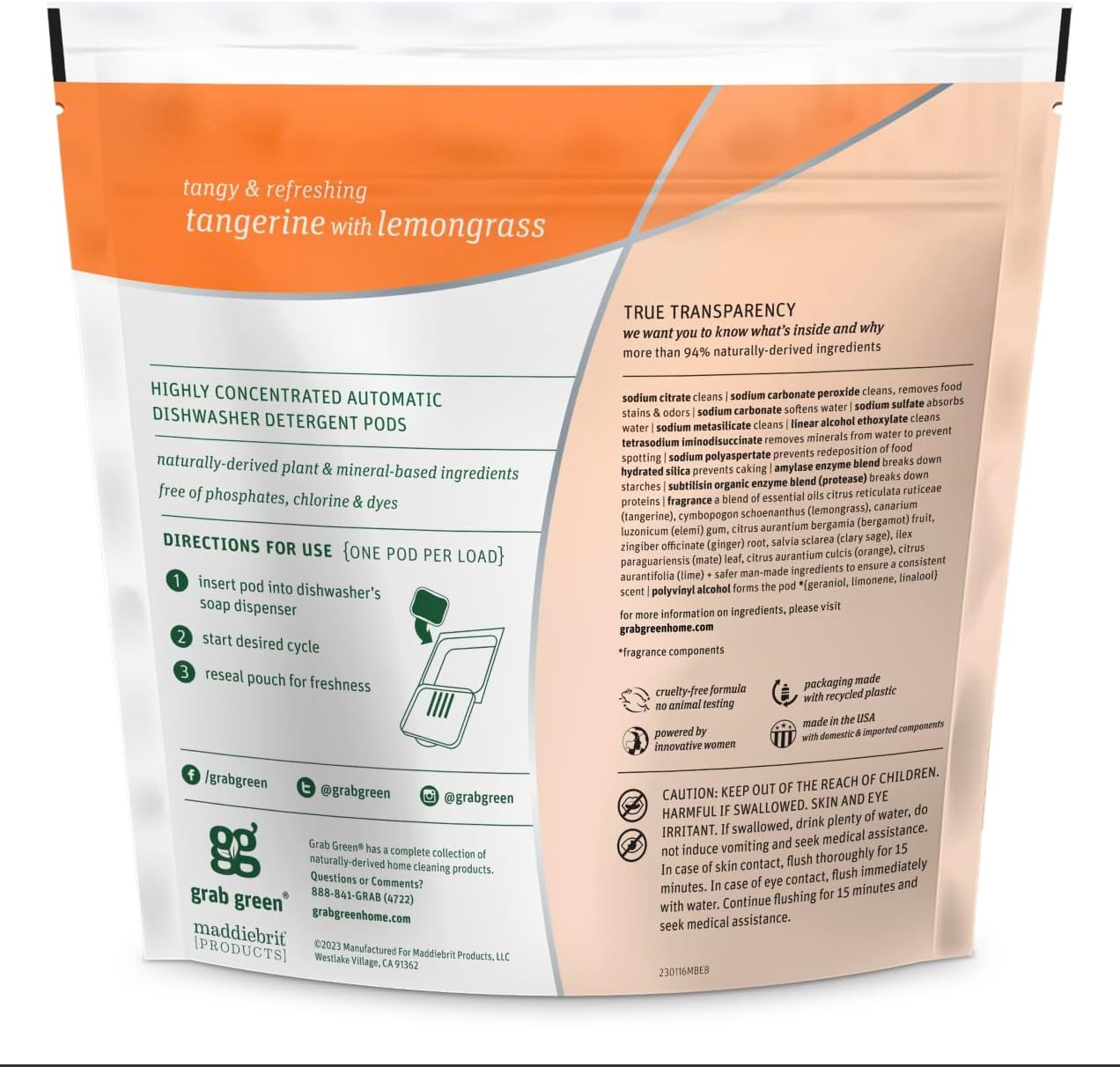 Grab Green Automatic Dishwashing Detergent Pods, 12 Count, Tangerine Lemongrass Scent, Plant and Mineral Based, Superior Cleaning, Powerful Grease Removal, Brilliant Shine