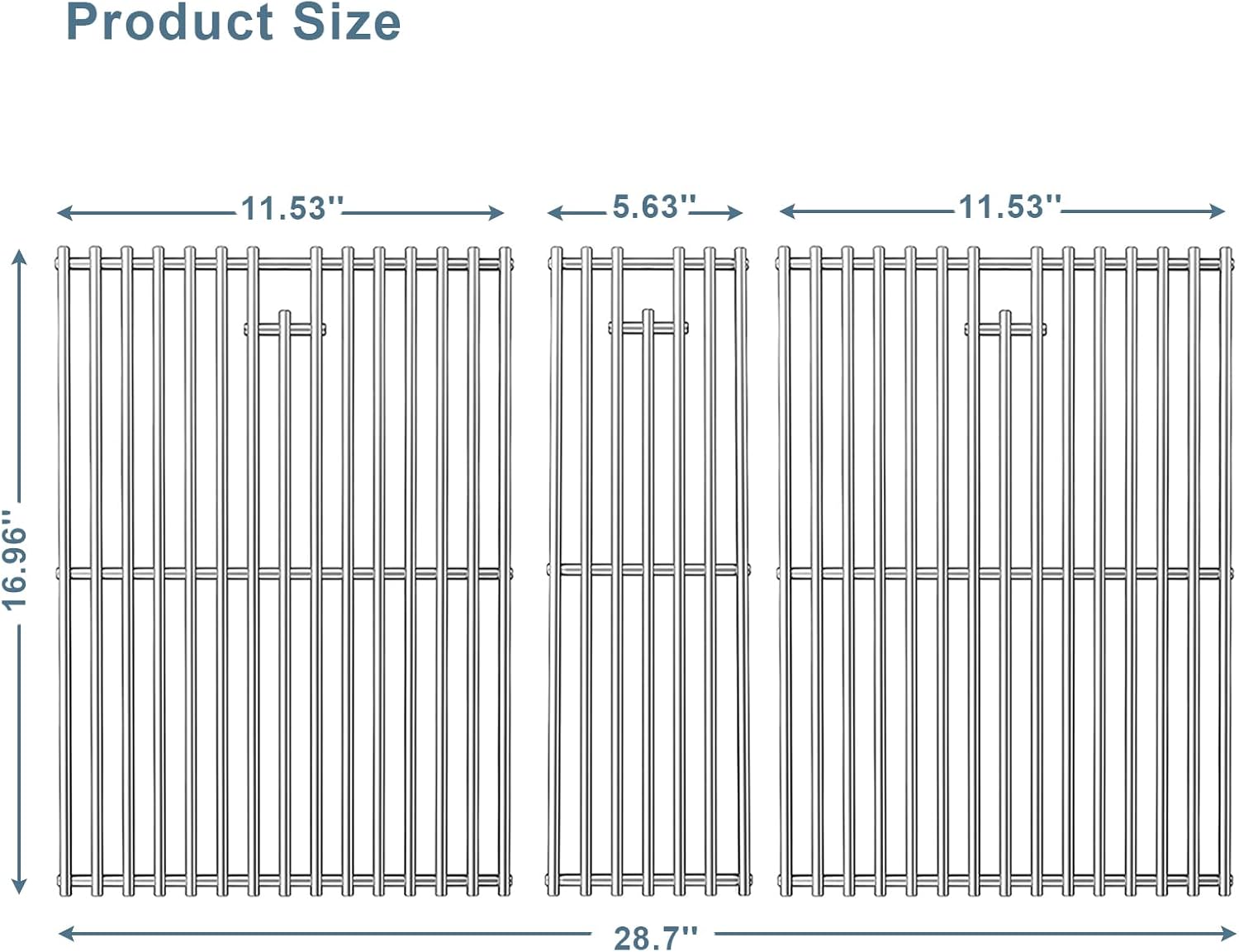- 【Material】The grill grates replacement parts are made of thicker high-quality stainless steel. 7mm heavy duty solid stainless steel grates are resist corrosion and heat resistance. More durable and safety, no need to replace your cooking grid grate again and again.