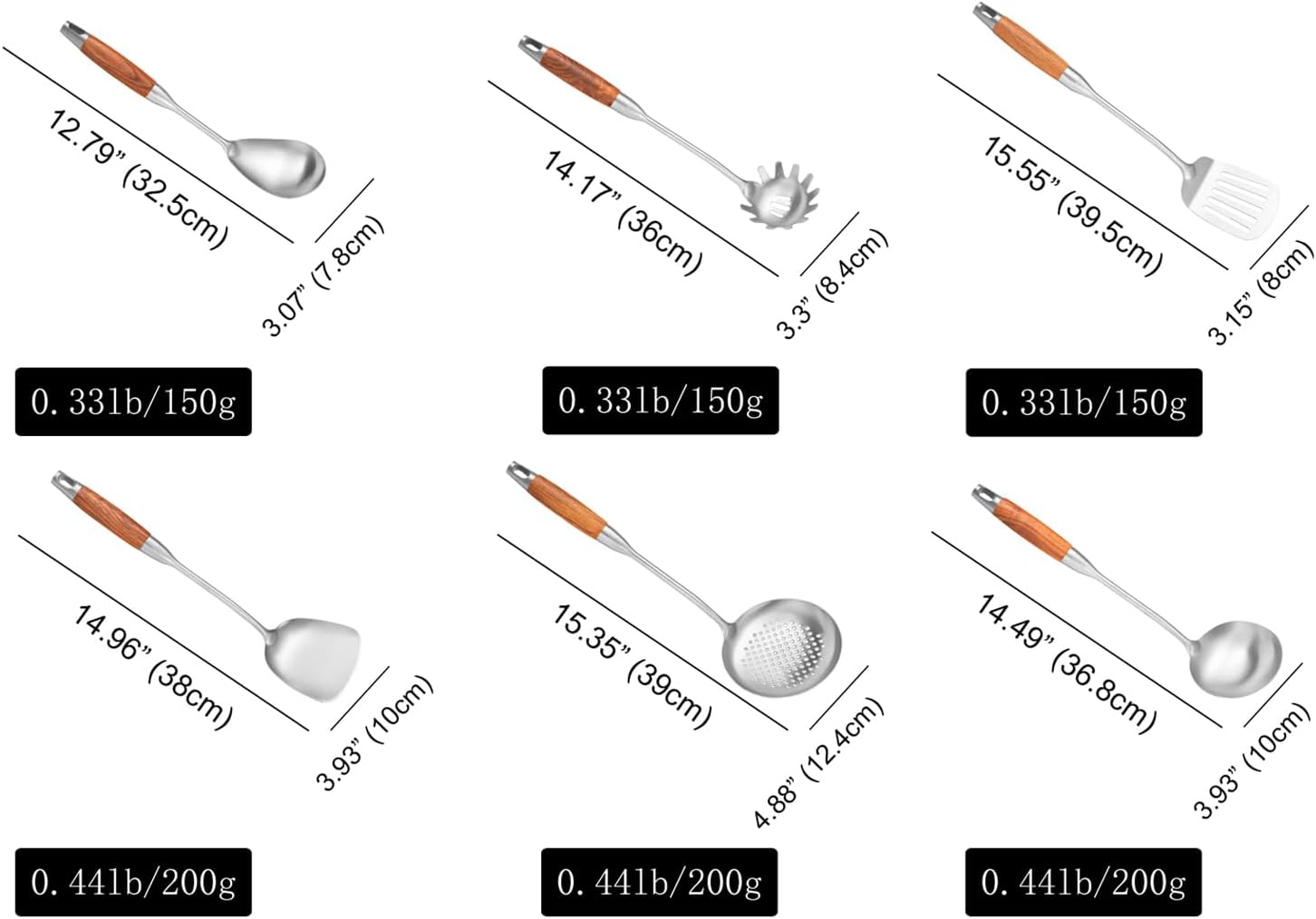 - Professional Kitchen Utensils Set: Clean lines, good weight and well balance. The wooden handles are not too heavy, help you eliminate stress on the arms and provide a comfortable ergonomic grip. Wooden handle reduce heat transfer, anti-scald, help you stay out of the soup or keep you away from the heat and flame.