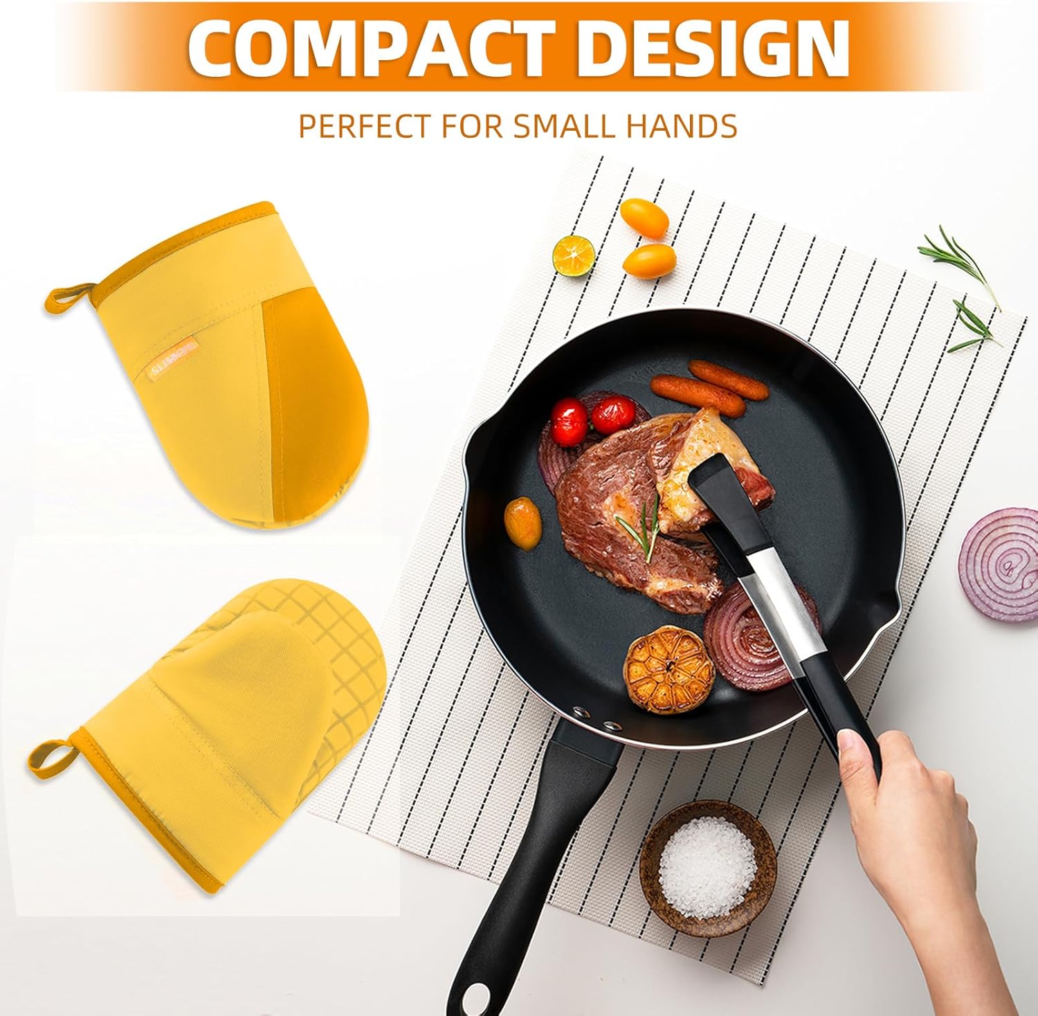 Mini Oven Mitts, Kitchen Oven Gloves Kitchen Mittens 500 Degrees Heat Resistant Baking Gloves, Non-Slip Silicone Surface with Hanging Loops Hot Gloves for Cooking, Baking, BBQ 1 Pair-Yellow