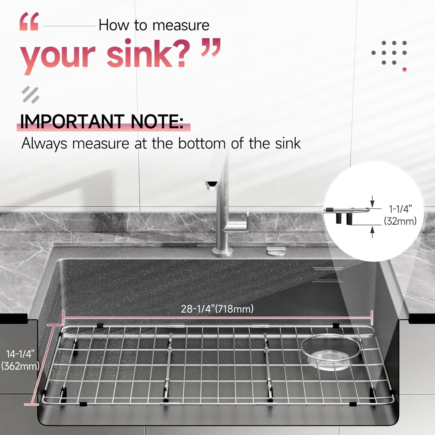 - Product Dimension: Sink Protectors for Kitchen Sink Dimension: 28.3" X 14.3". (Large Sink Grid, Please measure the sink carefully to choose the suitable sink grid.)