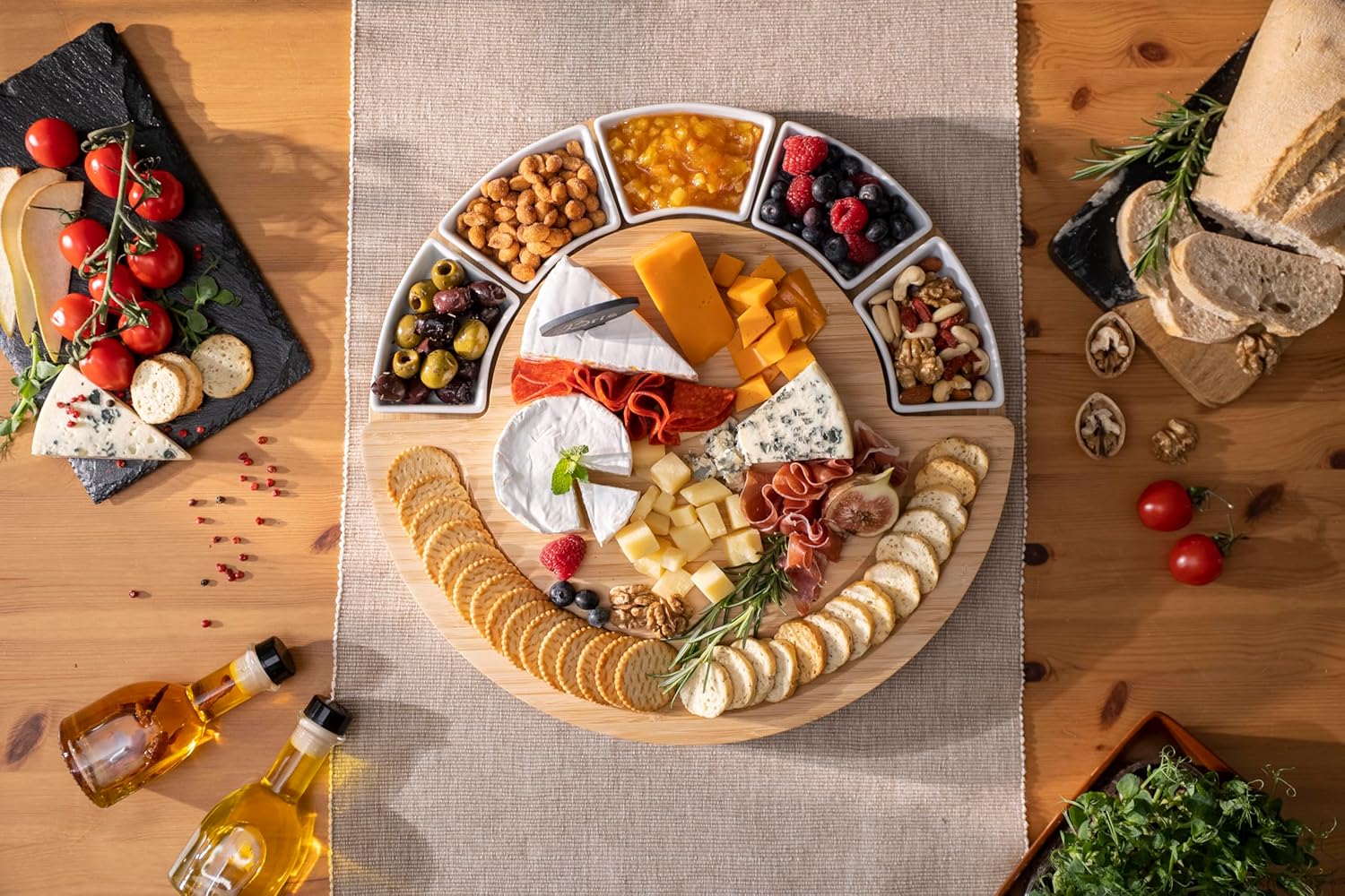 - More Spacious Than Most: Thanks to its wide 16 inches diameter, this bamboo wood cheese cutting tray has all the room you'll need for crackers, serving utensils and cutlery for cheese and meat.