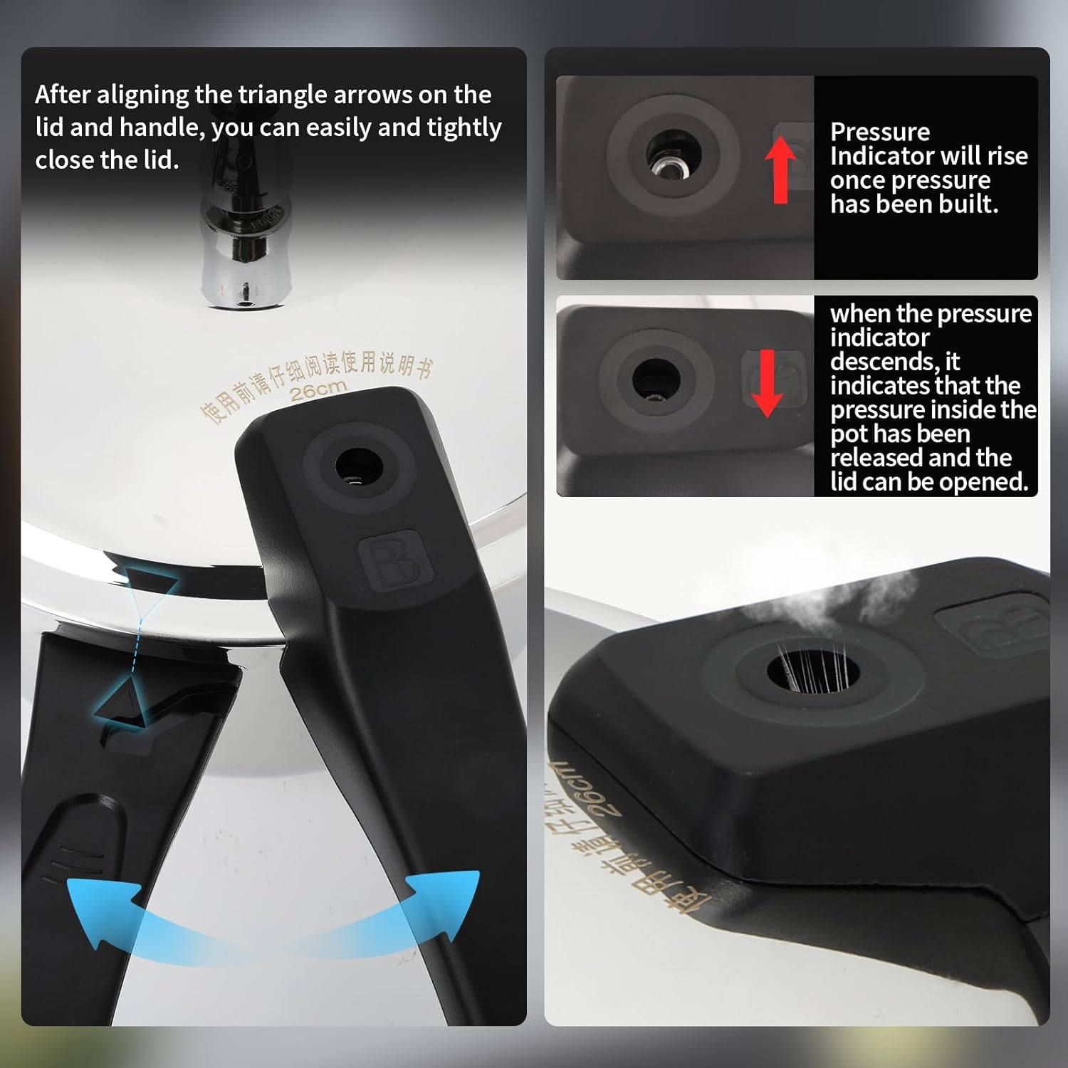 - β [Crafted from top-grade stainless steel and durability]-Our Stainless Steel Pressure Cooker 6 quart guarantees food safety and prevents any harmful reactions with your ingredients. Keep all the nutrients and flavors intact the healthier way! 6.3qt pressure cooker boasts quality stainless steel components and ergonomic handles for rust resistance and heat endurance.