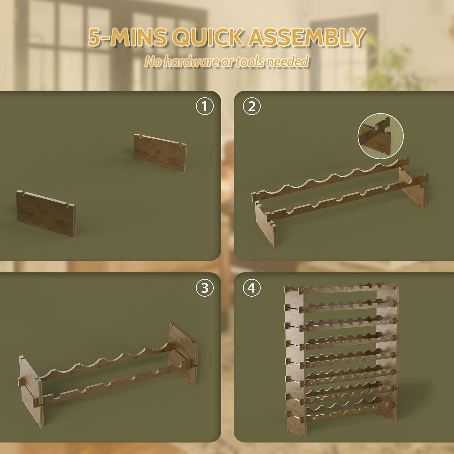 - ๐๐ฎ๐๐ ๐๐๐๐ฒ๐บ๐ฏ๐น๐: Each shelf of this modular stackable wine rack features deep grooves and the partitions are tightly fastened to each other without loosening; No tools required, Simple follow the assembly instructions to combine the partitions in order, and you'll have an elegant wooden wine rack in about 5 minutes (Please make sure whether the parts are positioned correctly before assembly); If you need to move the wine rack, please be sure to remove the wine bottles first