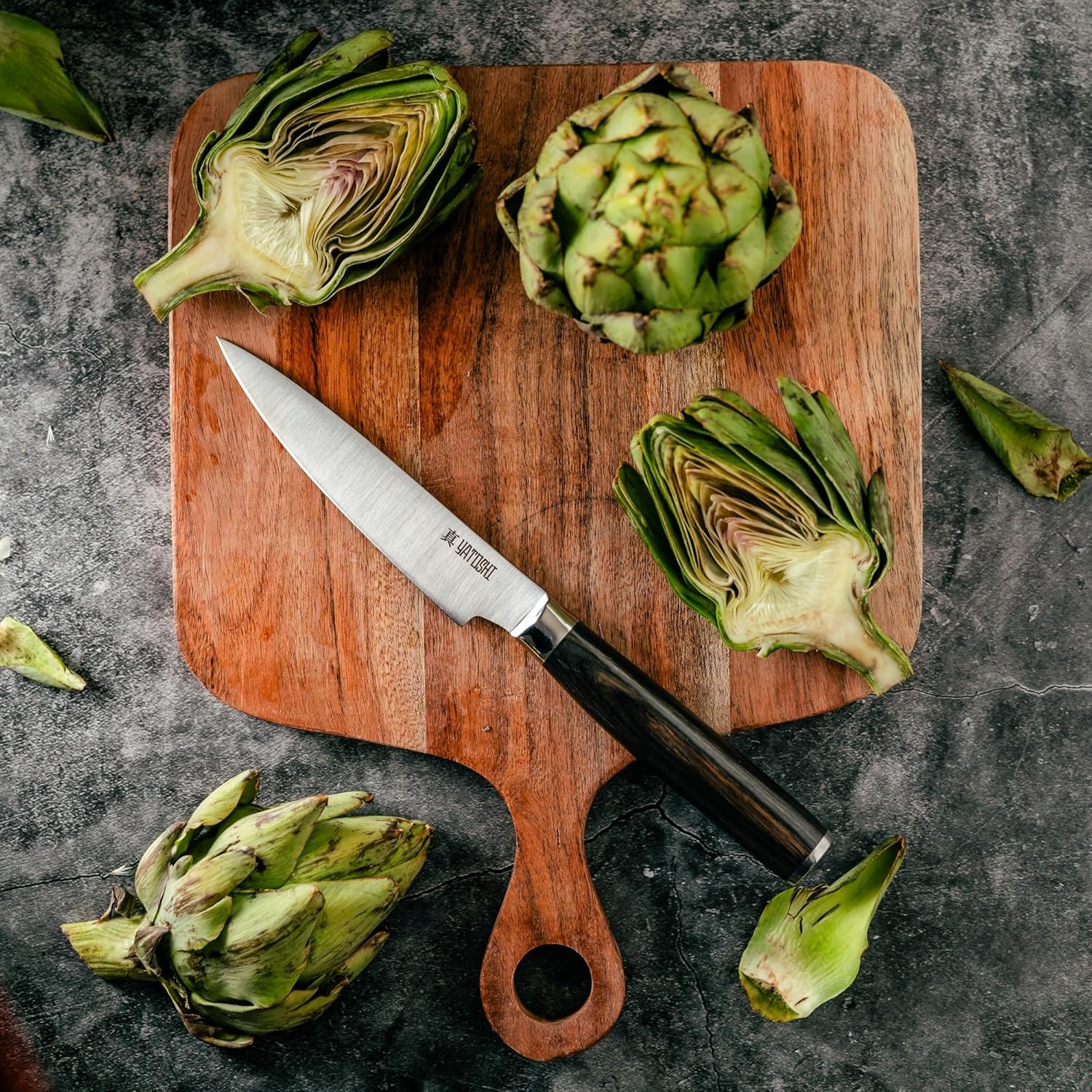 - Set Includes: 1x 8β Chefβs Knife, 1x 8β Bread Knife, 1x 8β Slicing Knife, 1x 5β Santoku Knife, 1x 5β Utility Knife, 1x 3.5β Paring Knife, 6x 5β Steak Knife, 1x 8β Honing Steel, 1x Pull-apart Utility Scissors, 1x Acacia Wood Knife Block
