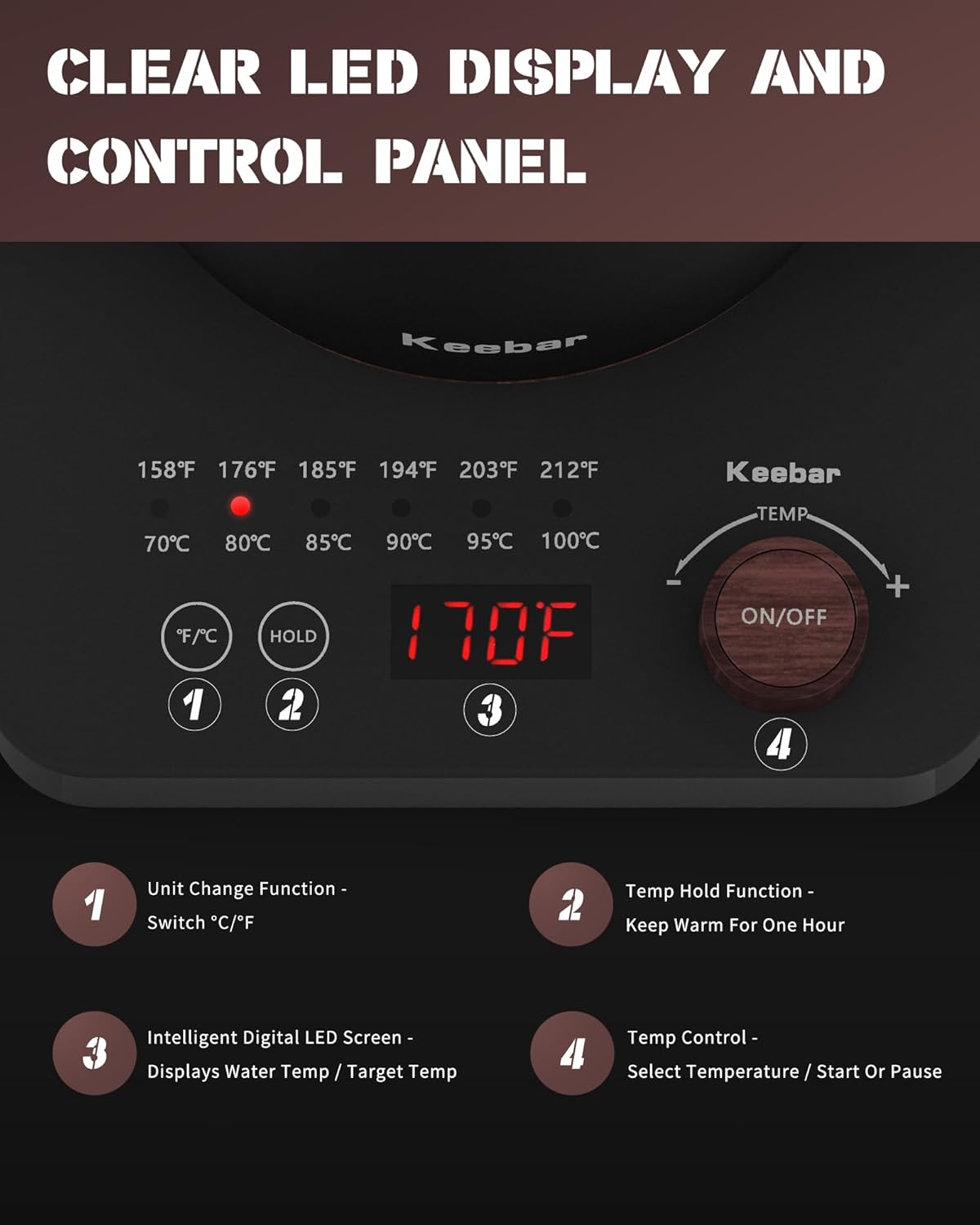 - 6 Easy Presets & Keep-Warm Contro - Elevate your brewing experience with six preset temperatures ranging from 158°F to 212°F. Easily adjust the settings with a simple twist of the knob and switch between Fahrenheit and Celsius. The LED screen displays the real-time water temperature, while the keep-warm function maintains it for up to 60 minutes.