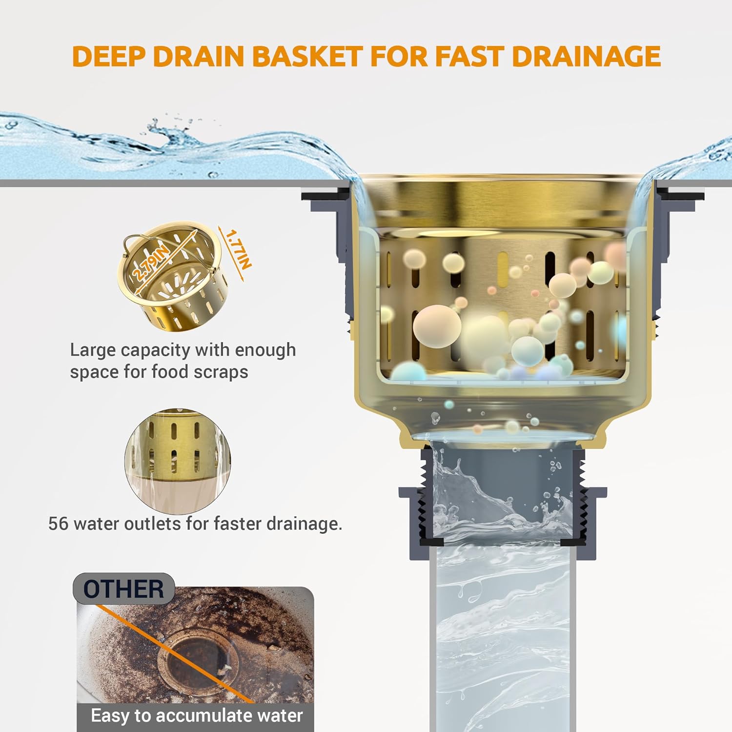 - EFFICIENT DOUBLE FILTRATION: Stainless steel sink strainer with removable deep strainer basket has 56 drain holes to quickly intercept food debris and jewellery and prevent clogging. The bottom divider prevents knives forks from falling down the drain.