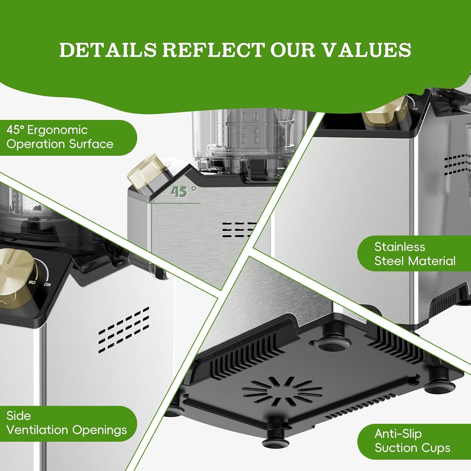- ăDesigned with Your Experience in Mindă: This electric juicer incorporates many thoughtful design details: a comfortable 45° angled control panel, a durable stainless steel body shell, an enhanced cooling system to extend its lifespan, and non-slip, vibration-absorbing suction cups... These innovative features are all intended to provide you with an exceptional user experience!
