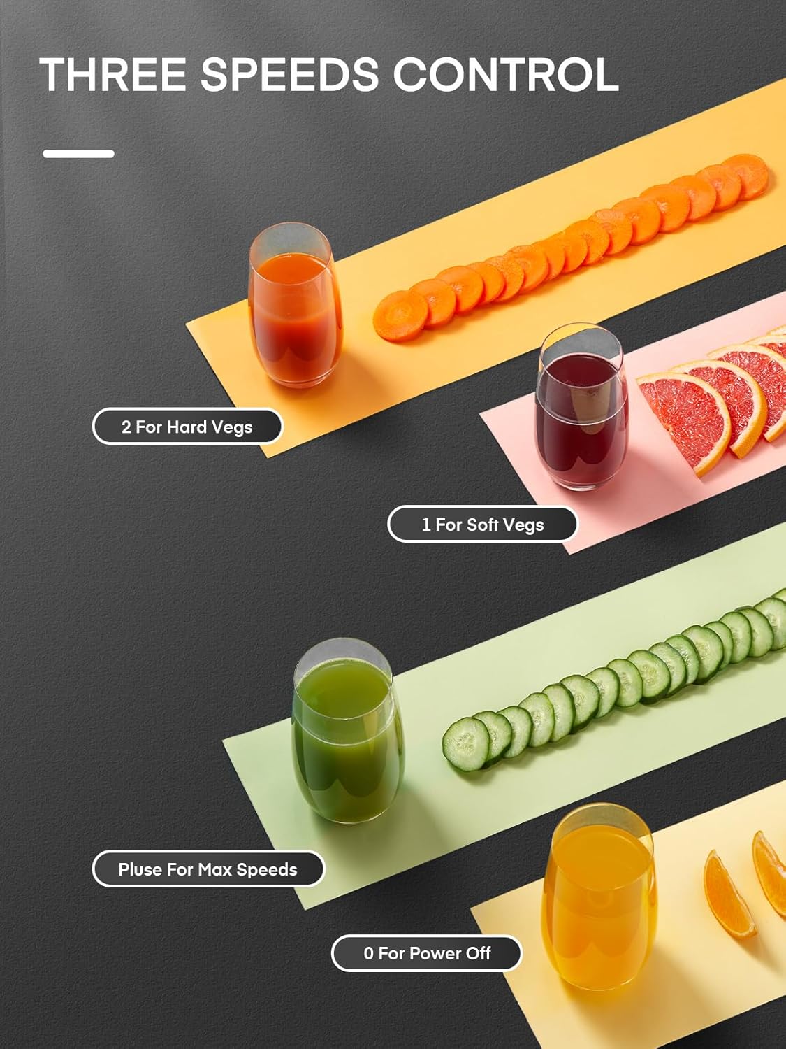 - 3-Speed Functions - "1" is a low speed, for soft fruits vegetables like oranges, watermelon, tomato, etc; "2" is a high speed, for hard food like apple, carrot, celery, etc. βPβ is the highest speed(Reach maximum speed after release). Customize your favorite juices, it makes the kitchen more colorful, you could juice a bunch of fresh juice and drink them to replenish energy and nutrition when needed