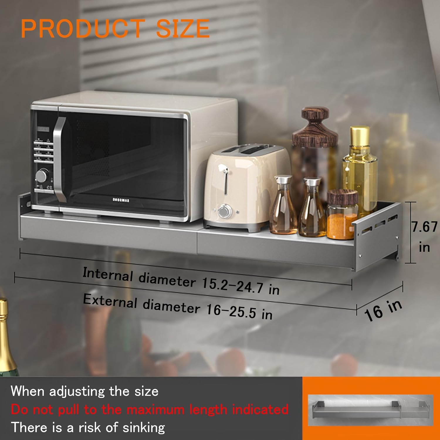 - Retractable and adjustable --- Place your microwave or electric oven on this wall-mounted stand, the length of which can be extended and mounted to suit your needs. You don't have to worry about the shelf being too long or too short. (Shelf: 16 inches wide, 16 inches before stretching, with a maximum load-bearing distance of 25.5 inches. Please do not exceed, as bending is prone to occur !!!!)