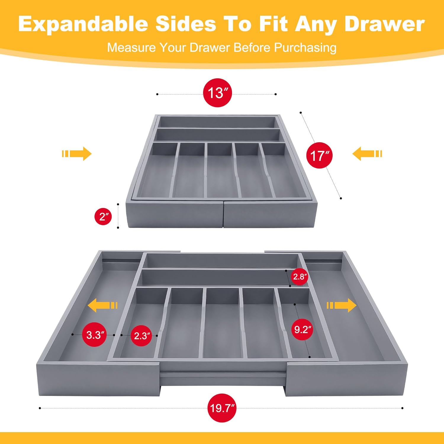 - ✅【Expandable to Fit Most Standard Kitchen Drawers】Our deep bamboo drawer organizer is ideal for saving kitchen storage space, thanks to its adjustable storage drawers that expand from 17”x13” to 17x19.7” wide with 1.9” deep slots. This drawer simply pulls away from both sides to expand from 7 to 9 compartments for extra storage space and to make the wider drawer more stable. Different sized compartments are available to store standard silverware and large cutlery.
