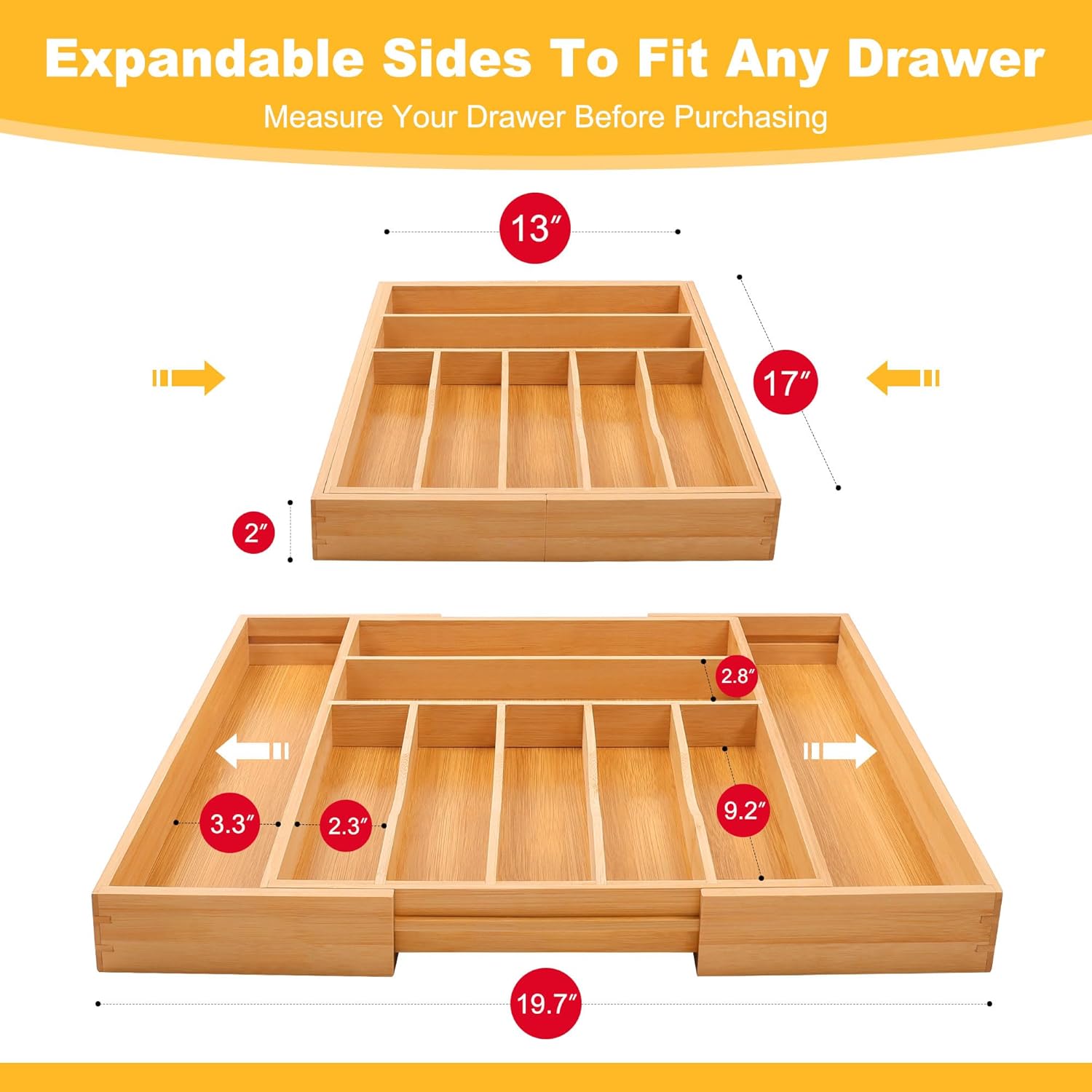 - ✅【Expandable to Fit Most Standard Kitchen Drawers】Our deep bamboo drawer organizer is ideal for saving kitchen storage space, thanks to its adjustable storage drawers that expand from 17”x13” to 17x19.7” wide with 1.9” deep slots. This drawer simply pulls away from both sides to expand from 7 to 9 compartments for extra storage space and to make the wider drawer more stable. Different sized compartments are available to store standard silverware and large cutlery.