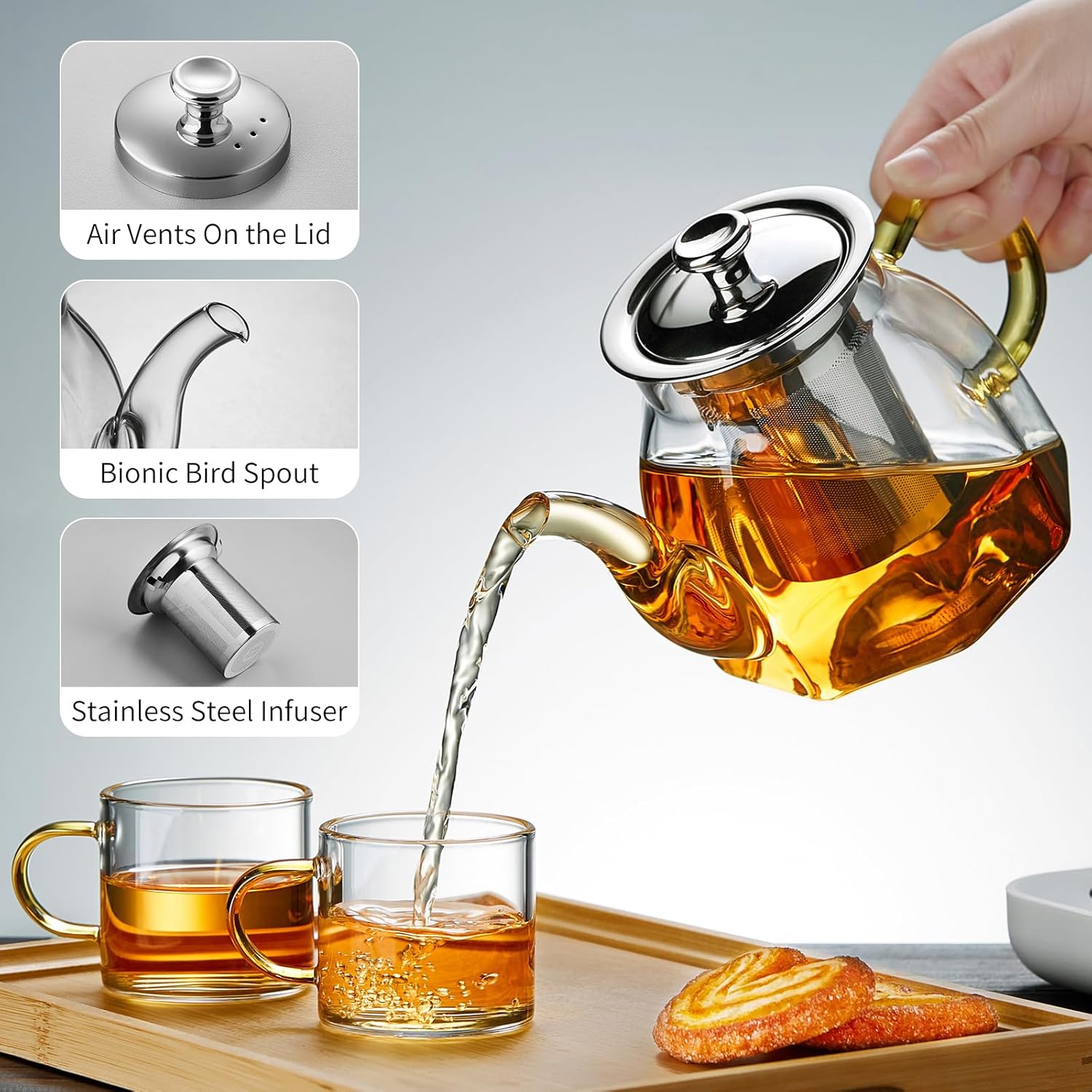Glass Tea Pot with Stainless Steel Infuser and Lid (Octagonal), Clear Glass Teapot, Borosilicate Hydrochloric Glass Heat Resistant, Fine Glass Filter for Flower Tea, Tea Bags (27 oz / 800 ml)