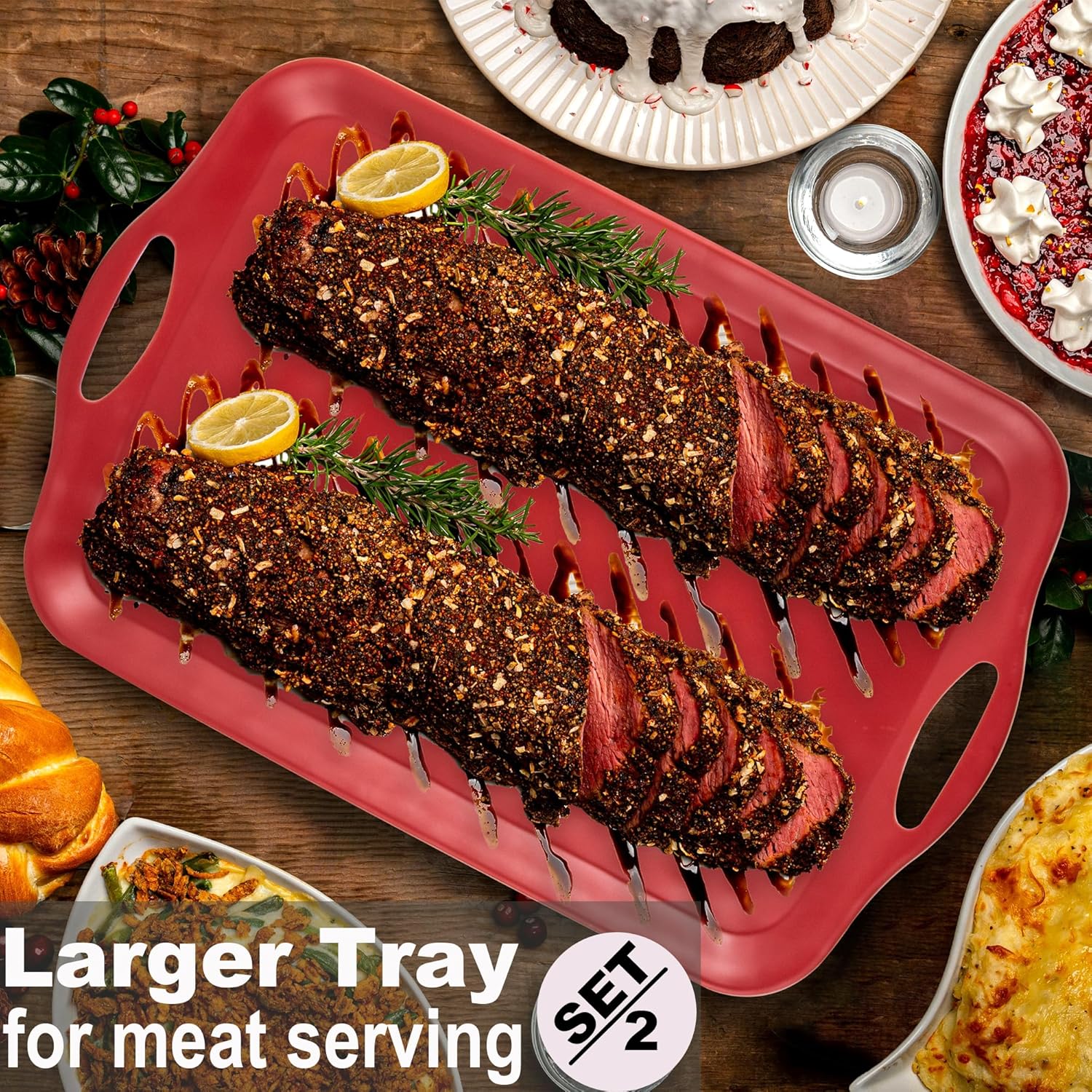 Extra Large Serving Tray with Handles, 20x13 inch, Set of 2 Melamine Platters for Serving Food, Turkey, Cookie, Rectangular Trays for Eating, Raised Dots Matt Finished, Dishwasher Safe, Red